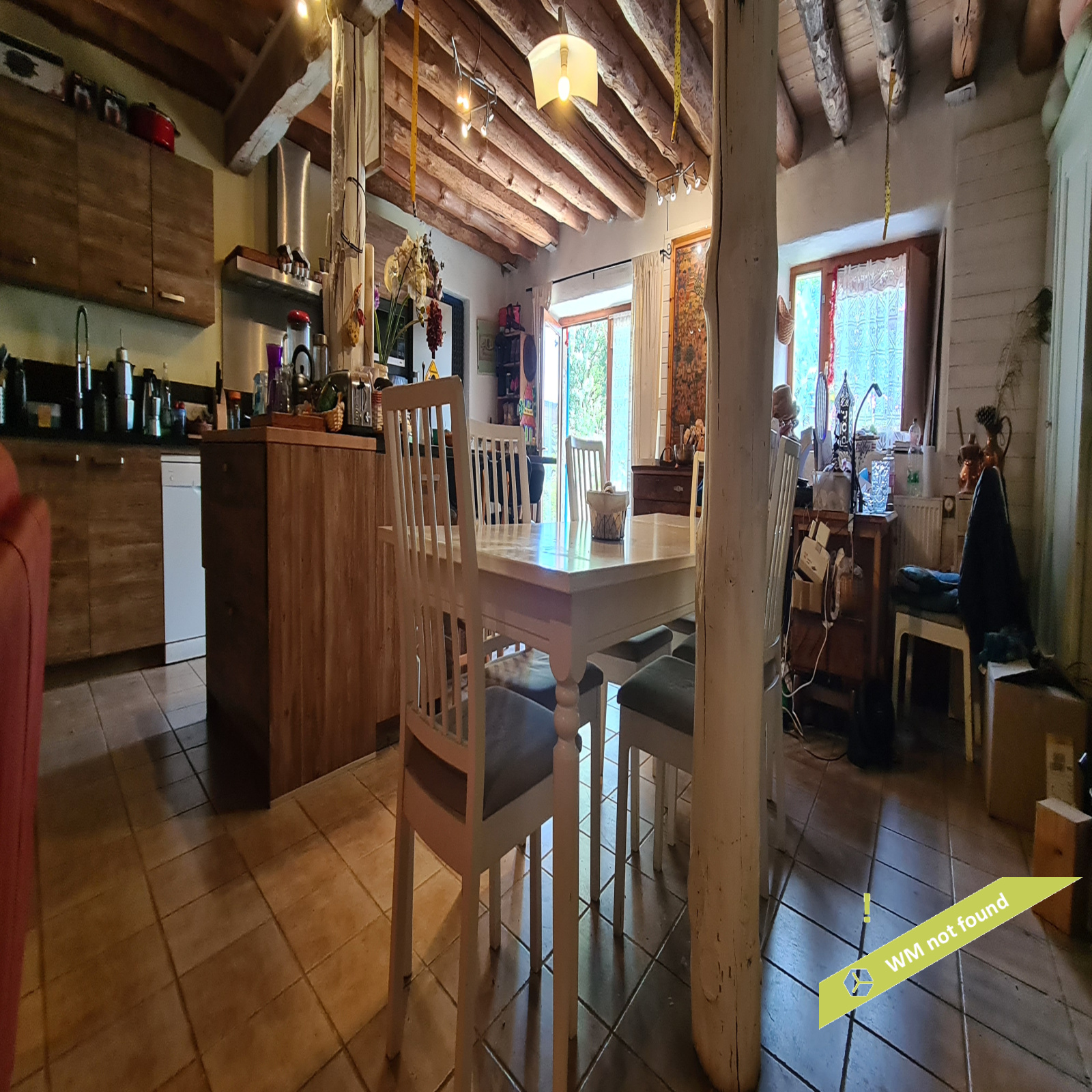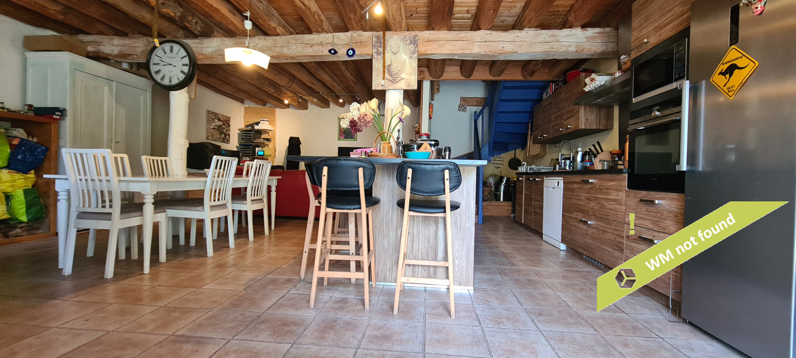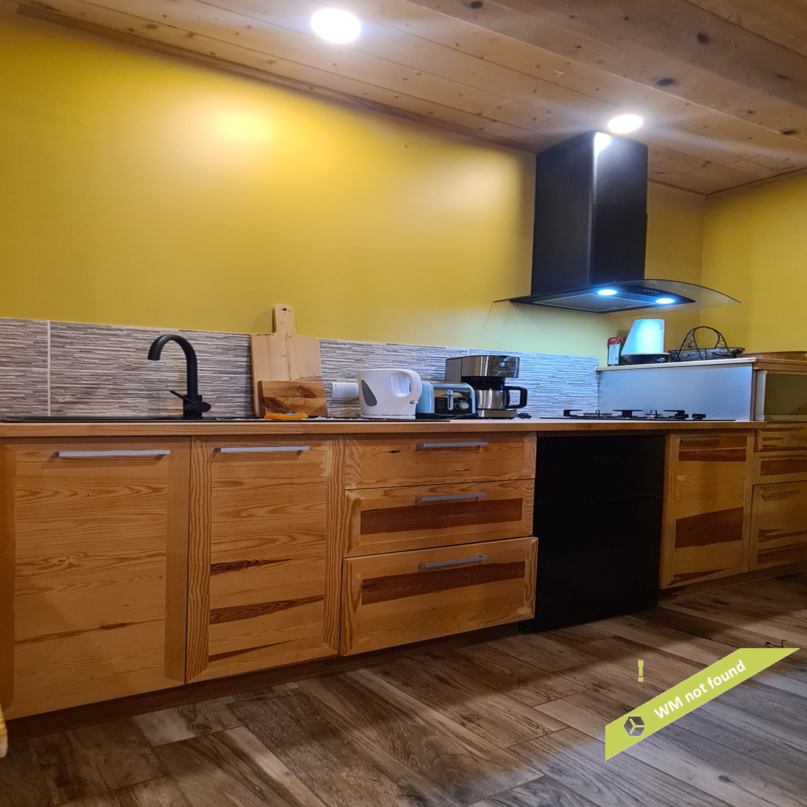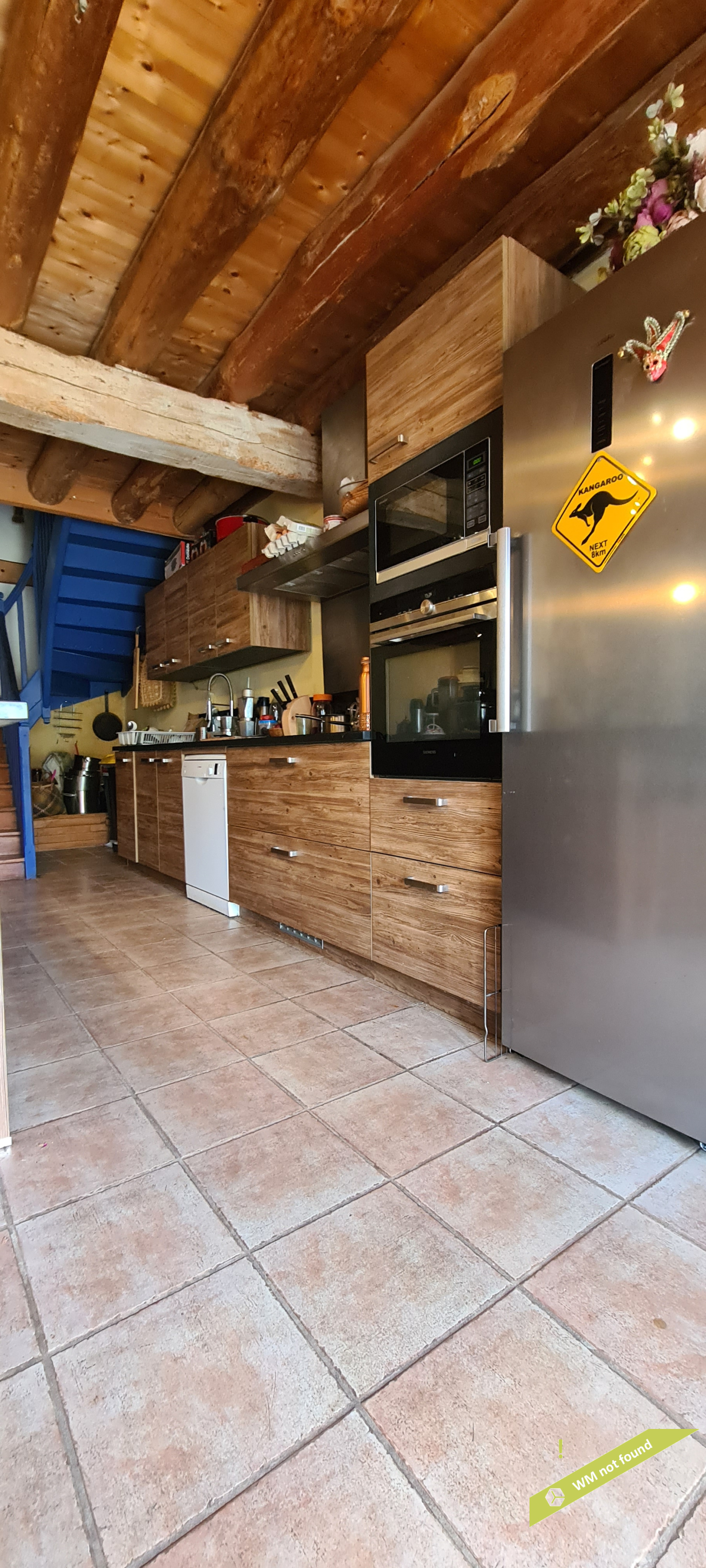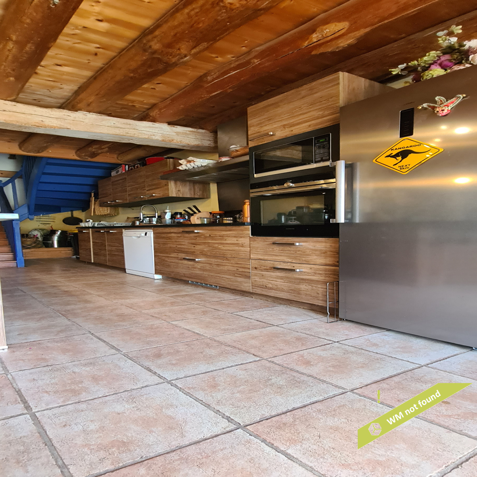 - Rez-de-chaussée : pièce de vie de 56 m² (cuisine ouverte, salle à manger, salon avec poêle à bois)
