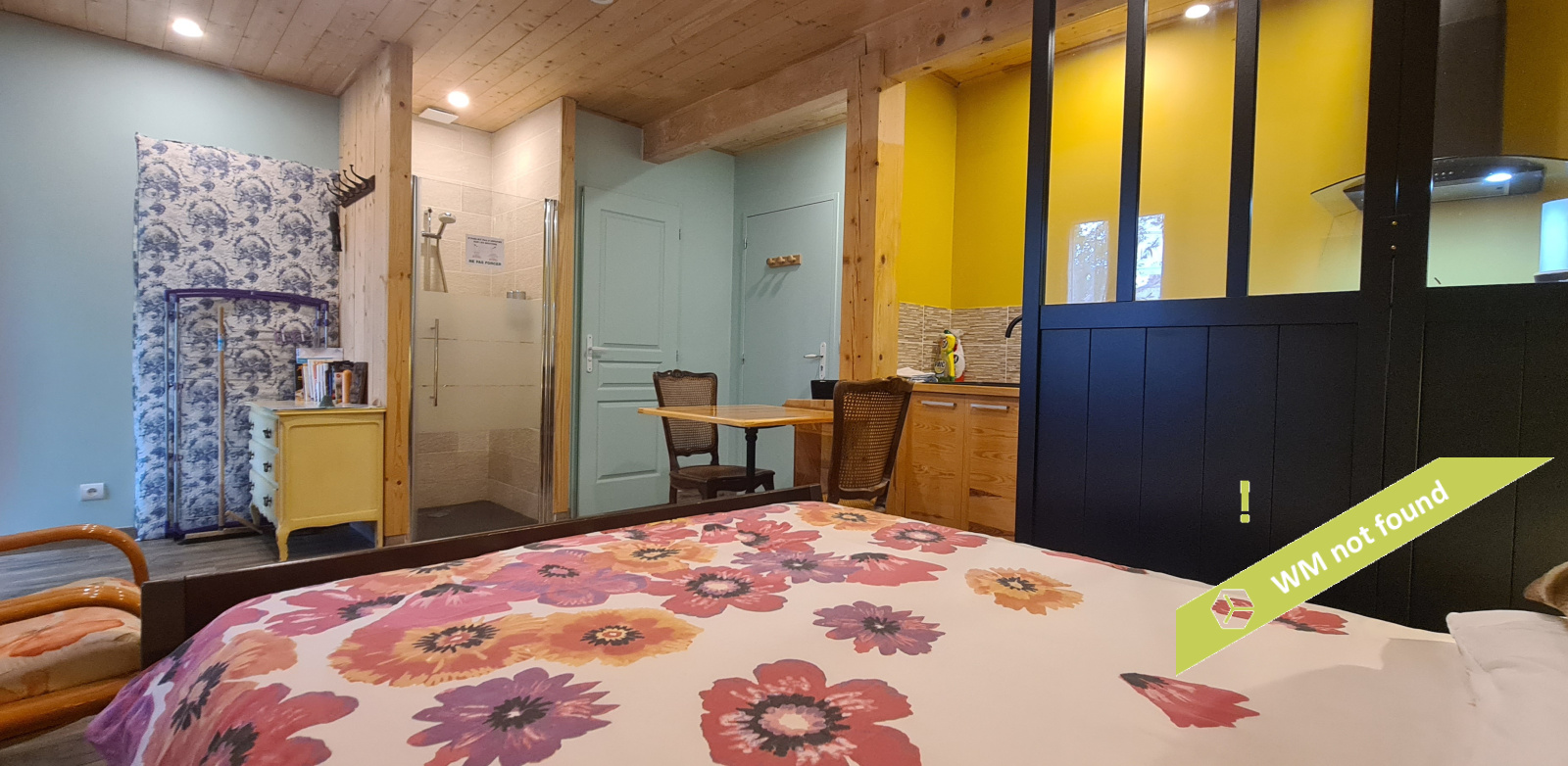 Gîte indépendant (52 m², plain-pied) : séjour avec cuisine équipée, 2 espaces nuit (chambre avec douche + coin lits superposés), wc