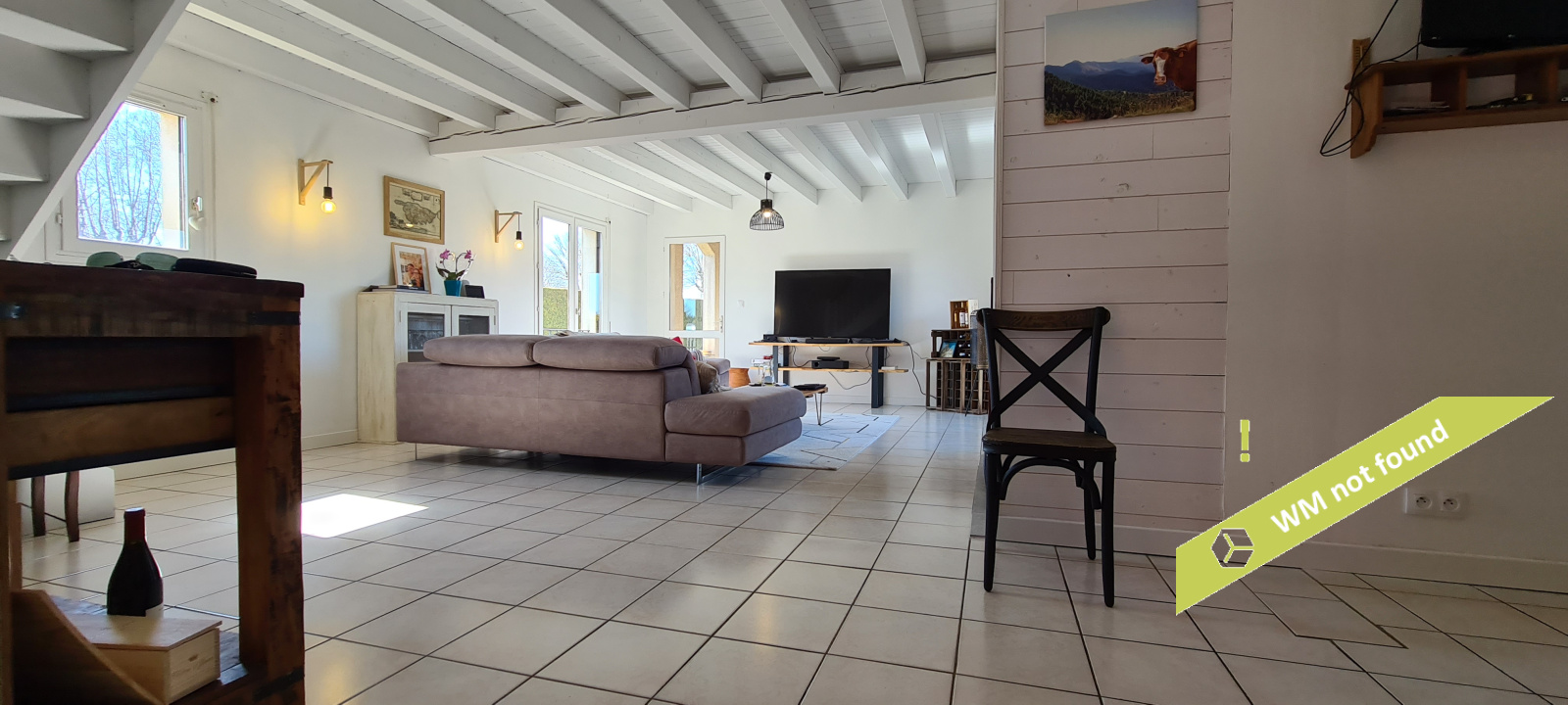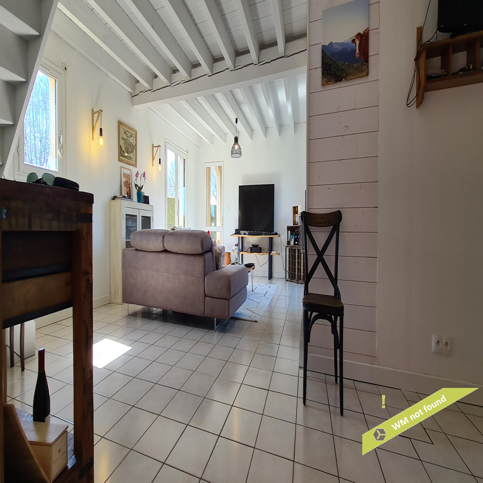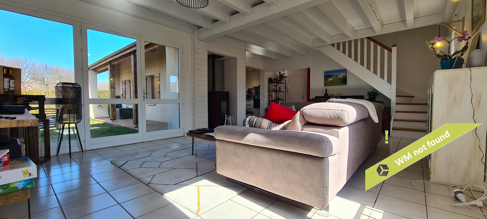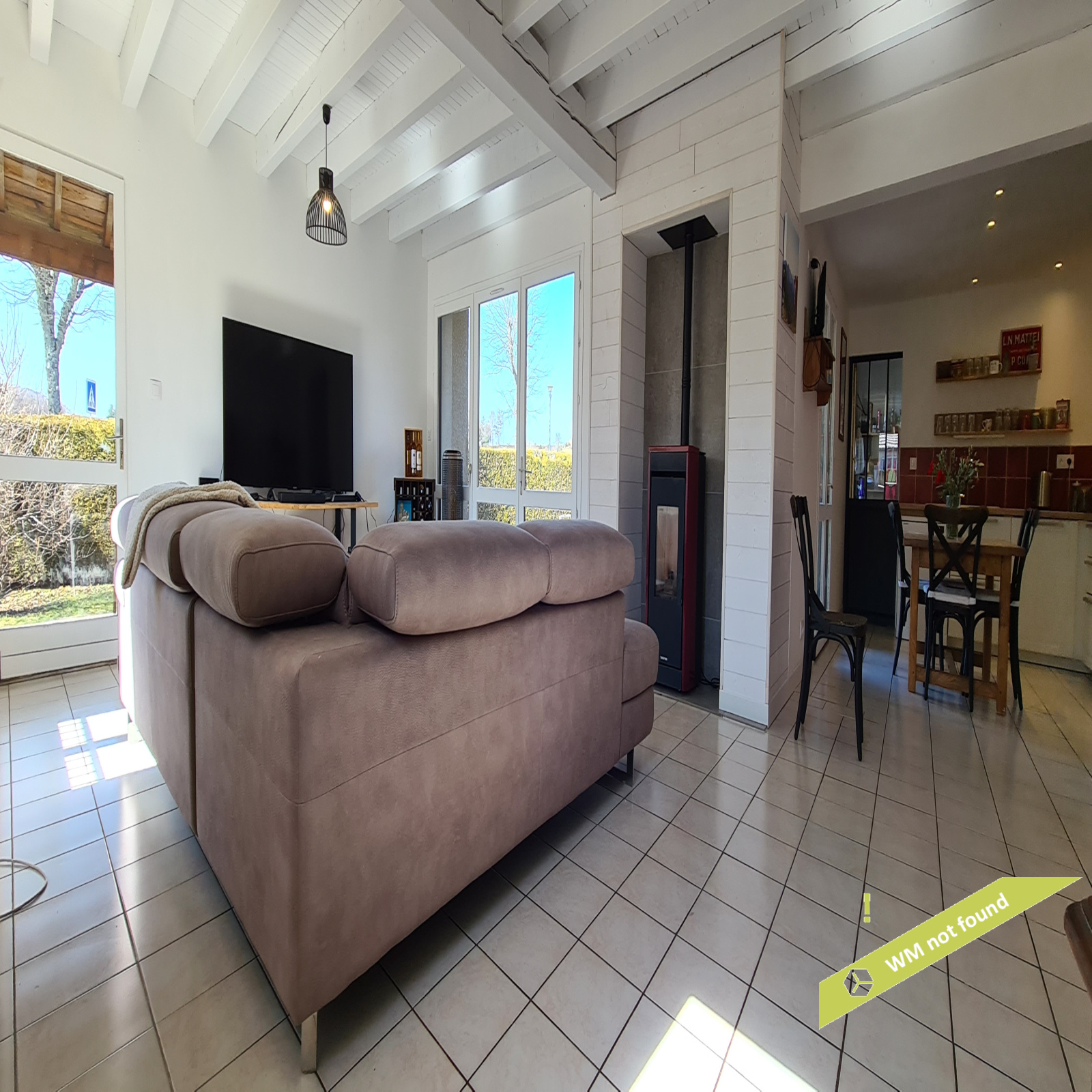 - au rez-de-chaussée, on trouve un salon/salle-à-manger (35,79 m²) ouvert sur la cuisine (15,81 m²). Cet espace est très lumineux, 2 baies vitrées permettent notamment d'accéder aux terrasses et au jardin. Un poêle à granulés contribue au caractère chaleureux de la pièce. Ce niveau est complété par un cellier, un couloir desservant deux chambres (14,95 m² et 13,80 m²), un wc et une salle d'eau.