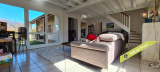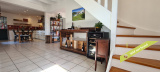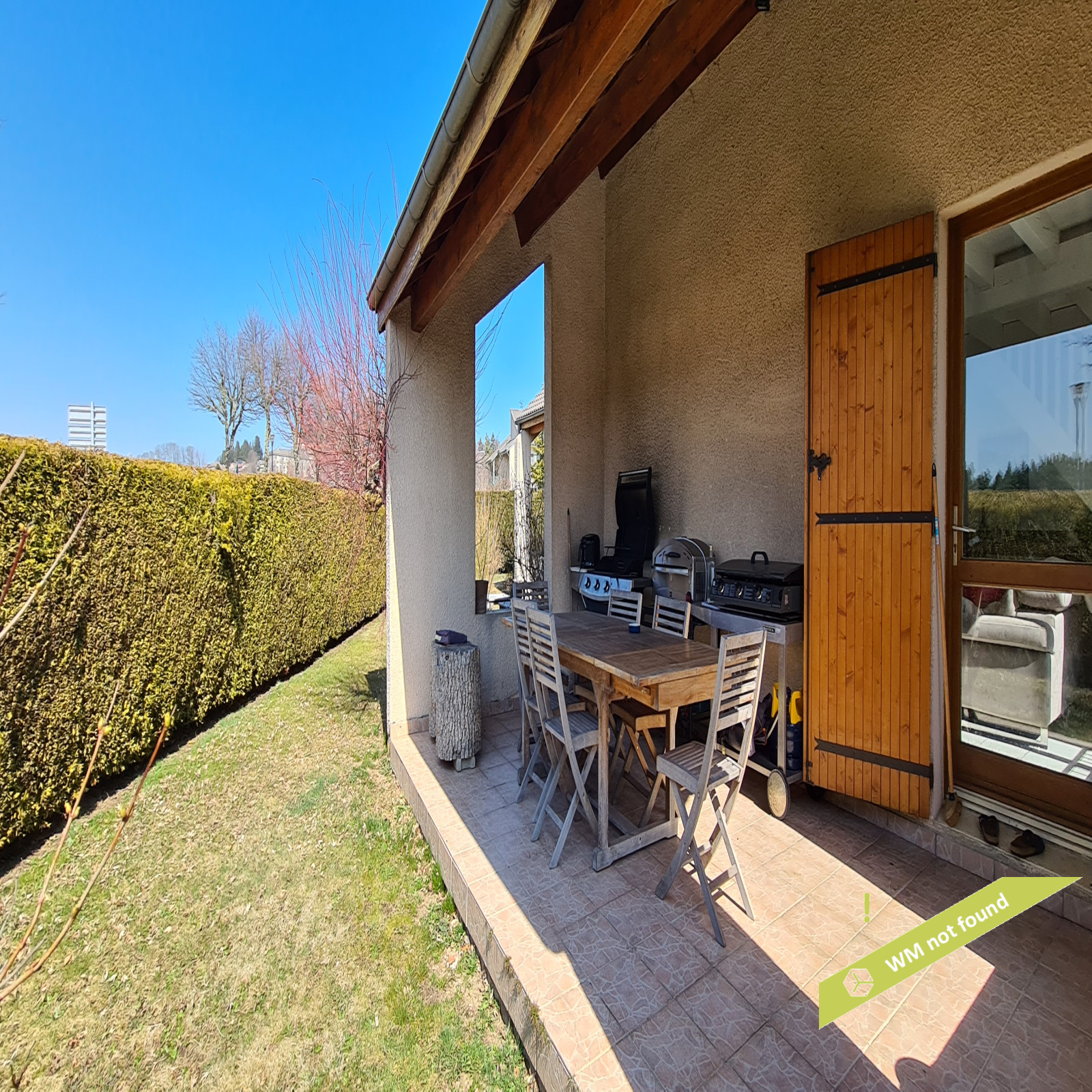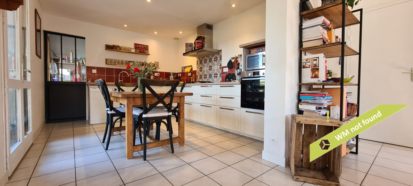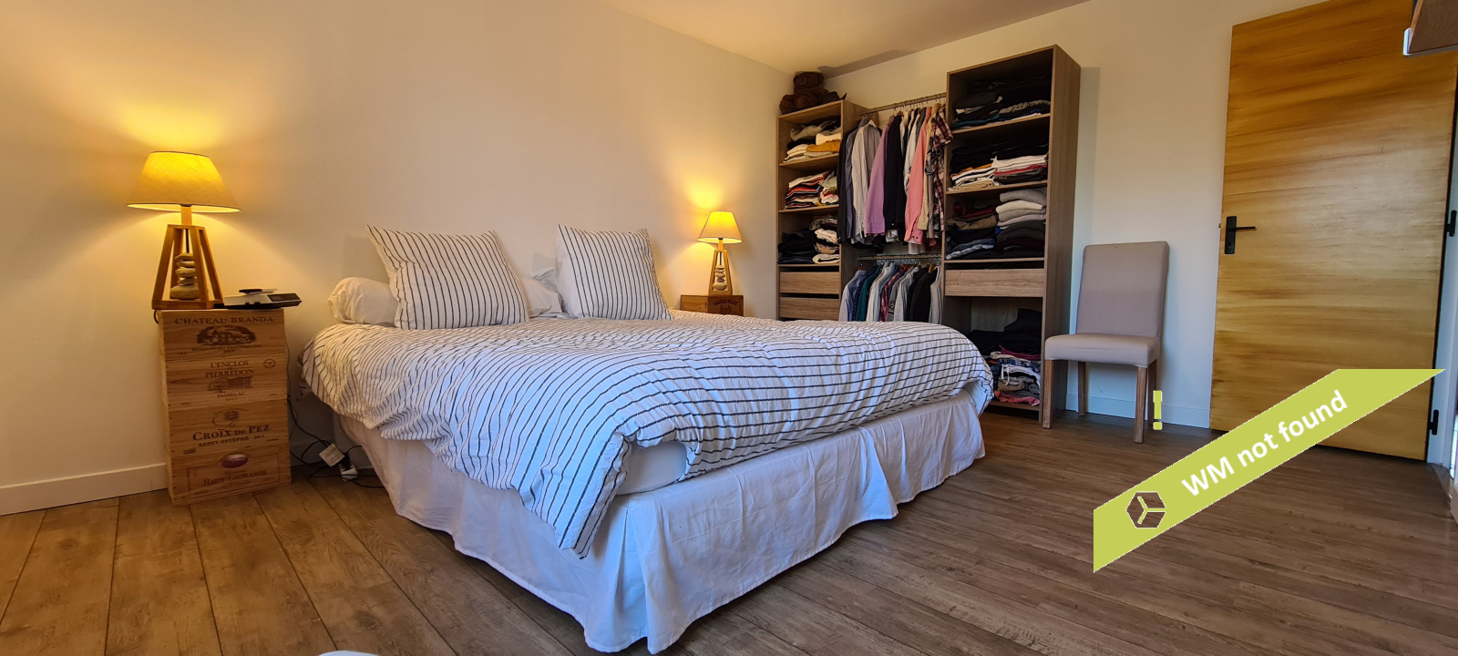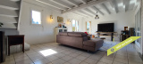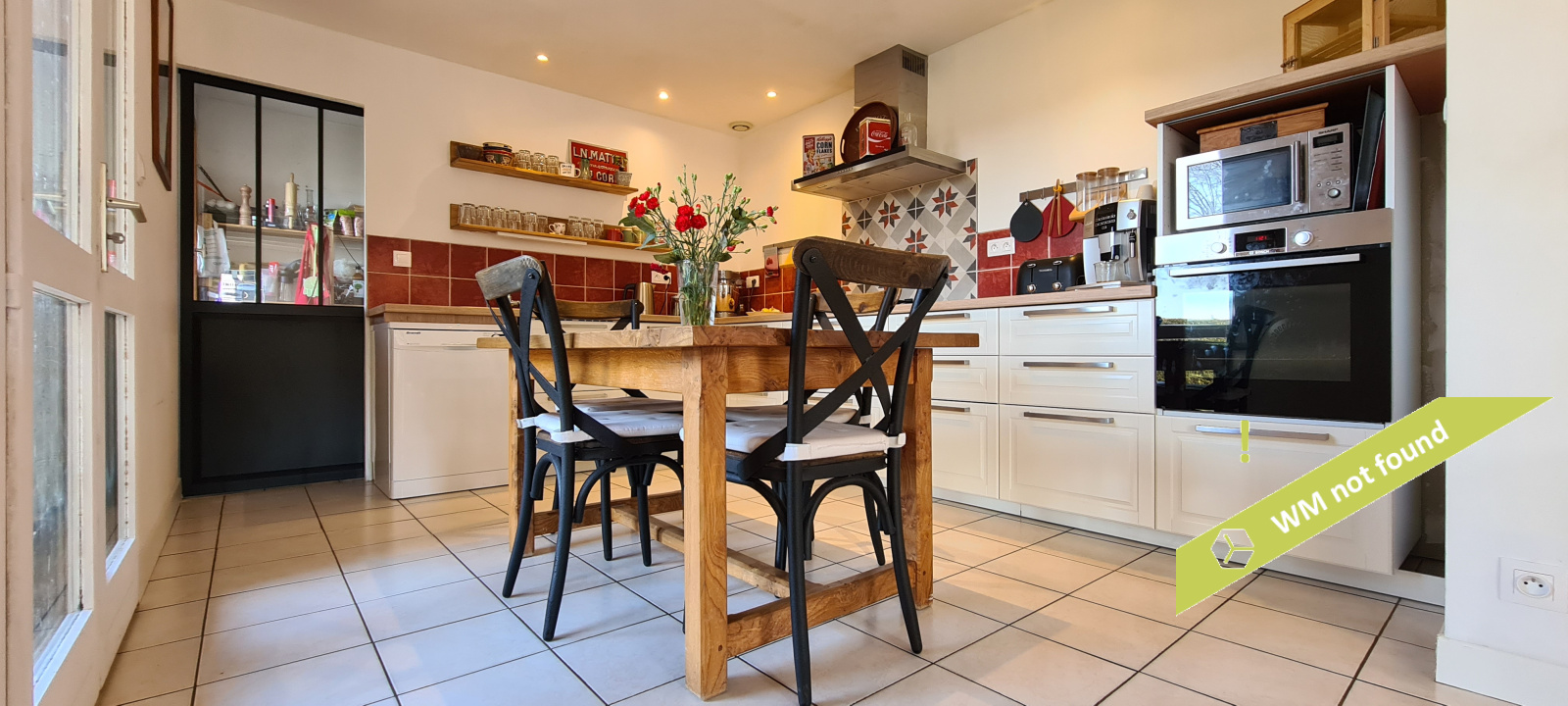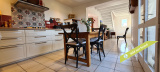 - au rez-de-chaussée, on trouve un salon/salle-à-manger (35,79 m²) ouvert sur la cuisine (15,81 m²). Cet espace est très lumineux, 2 baies vitrées permettent notamment d'accéder aux terrasses et au jardin. Un poêle à granulés contribue au caractère chaleureux de la pièce. Ce niveau est complété par un cellier, un couloir desservant deux chambres (14,95 m² et 13,80 m²), un wc et une salle d'eau.