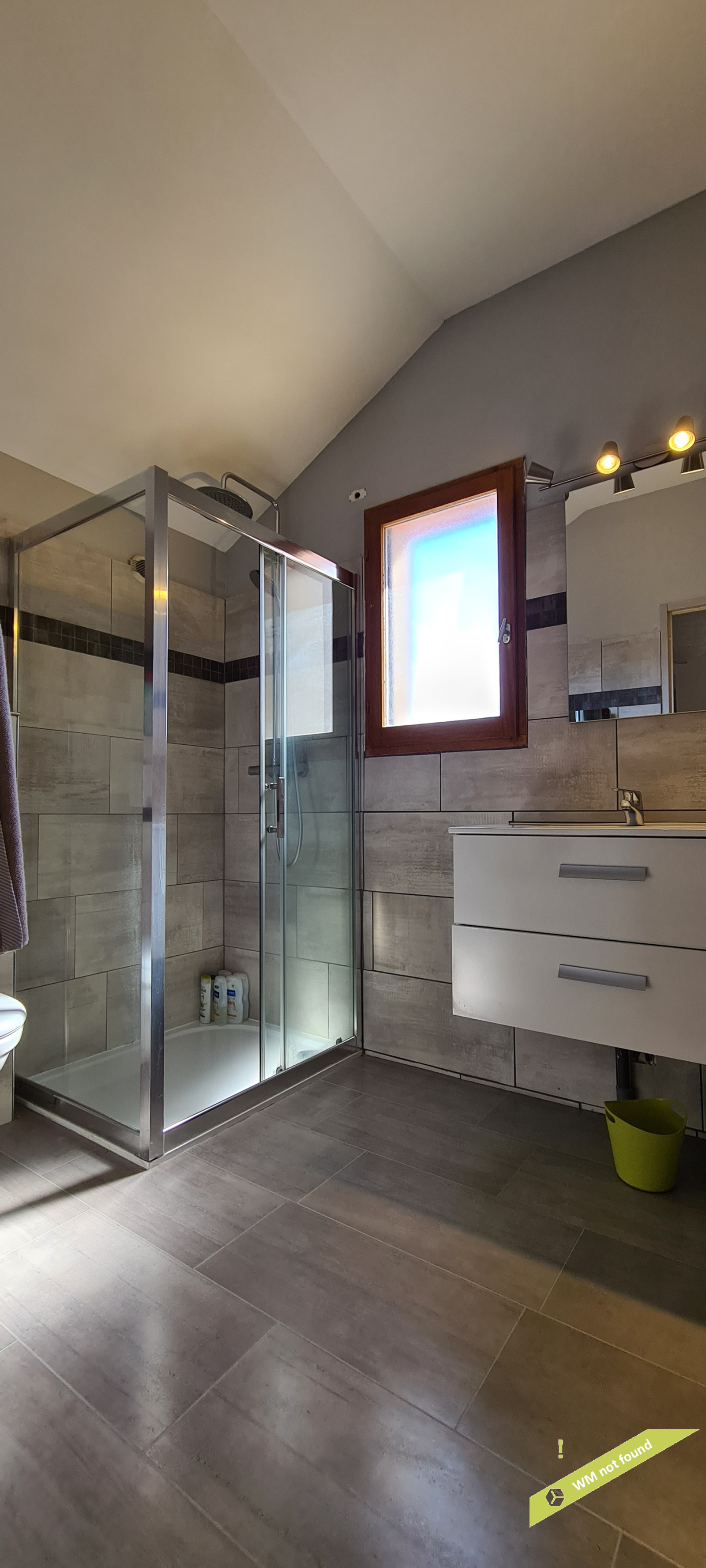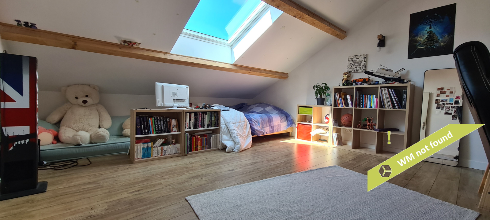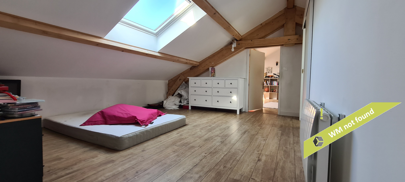 - le 1er étage est composé d'une chambre mansardée avec placard, de 17,20 m² (pour une surface au sol de 23,67 m²). Cette chambre dispose d'un petit balcon. On trouve également un vaste dégagement desservant une 1ère salle d'eau avec wc et deux espaces mansardés en enfilade, le 1er de 6,11 m² (pour 18,58 m² au sol) et le 2ème de 15,24 m² (pour 30,09 m² au sol). Une 2ème salle d'eau avec wc complète cet étage. Ces deux espaces peuvent servir de chambre, de salle de jeux, de bureau, de bibliothèque...