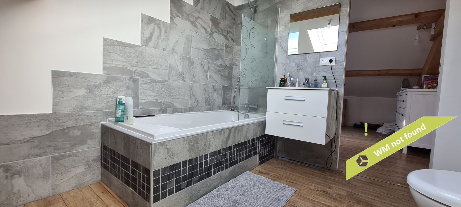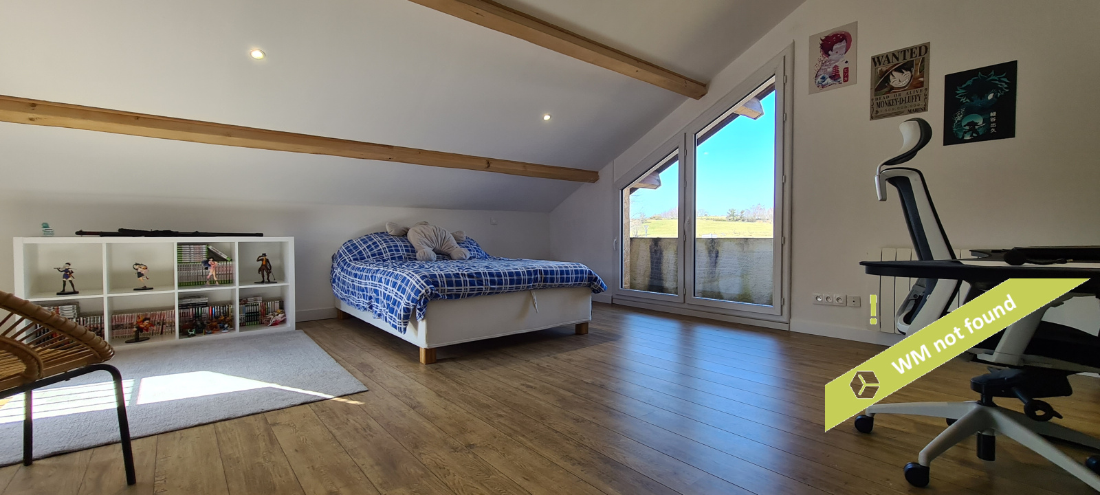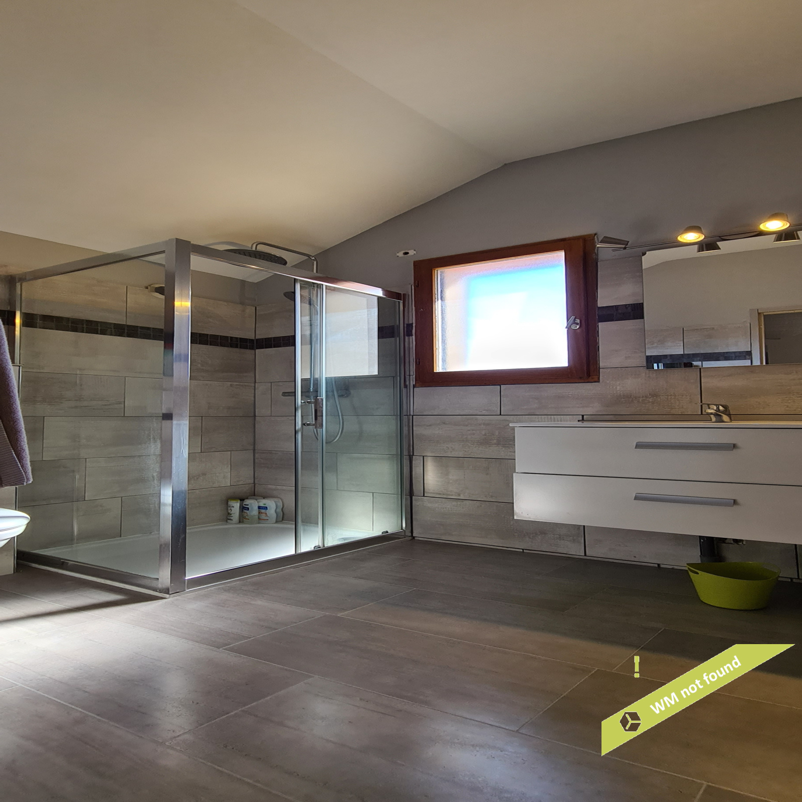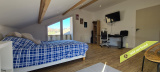 - le 1er étage est composé d'une chambre mansardée avec placard, de 17,20 m² (pour une surface au sol de 23,67 m²). Cette chambre dispose d'un petit balcon. On trouve également un vaste dégagement desservant une 1ère salle d'eau avec wc et deux espaces mansardés en enfilade, le 1er de 6,11 m² (pour 18,58 m² au sol) et le 2ème de 15,24 m² (pour 30,09 m² au sol). Une 2ème salle d'eau avec wc complète cet étage. Ces deux espaces peuvent servir de chambre, de salle de jeux, de bureau, de bibliothèque...