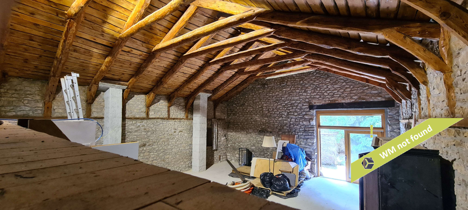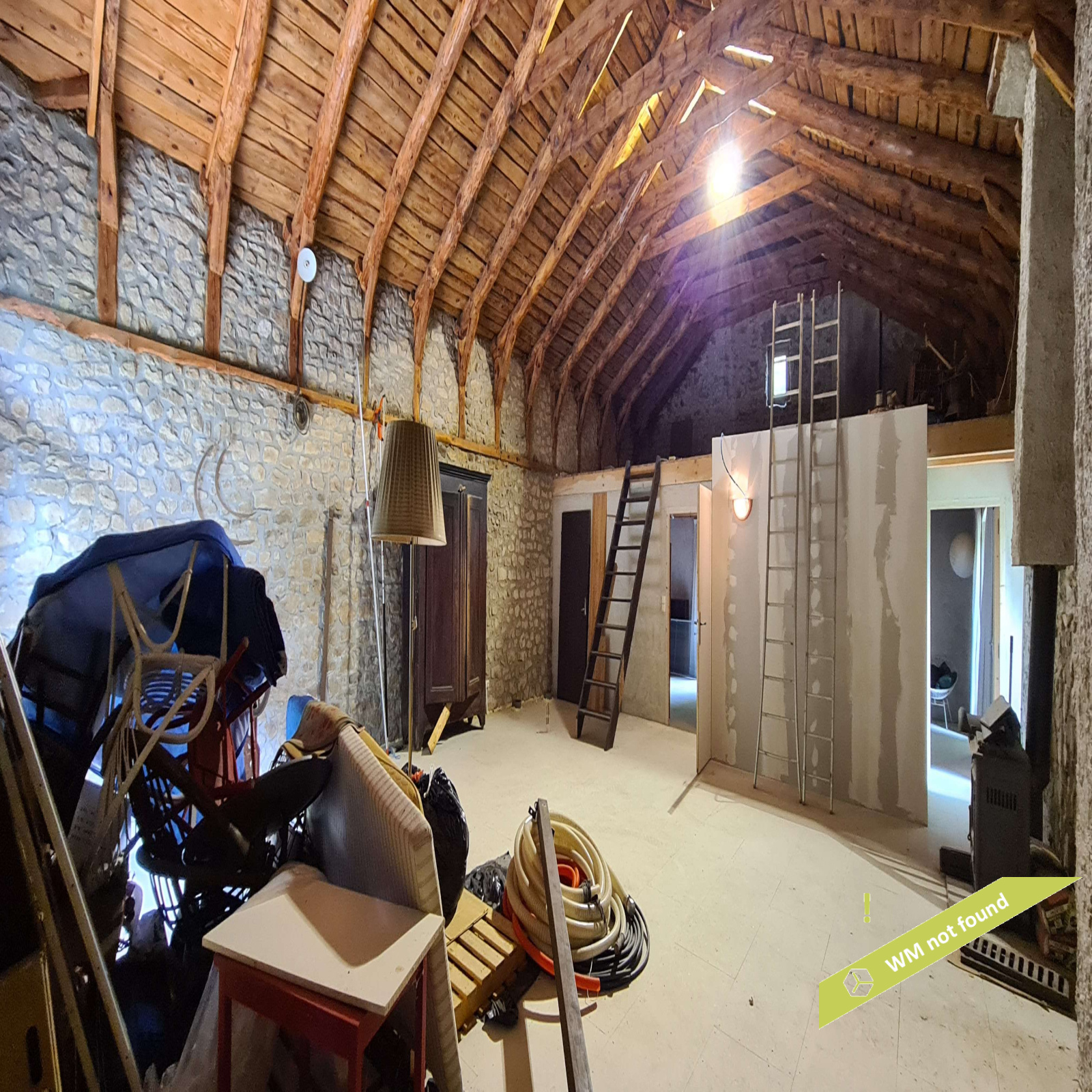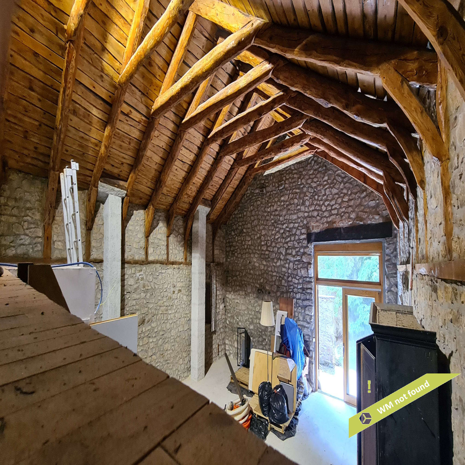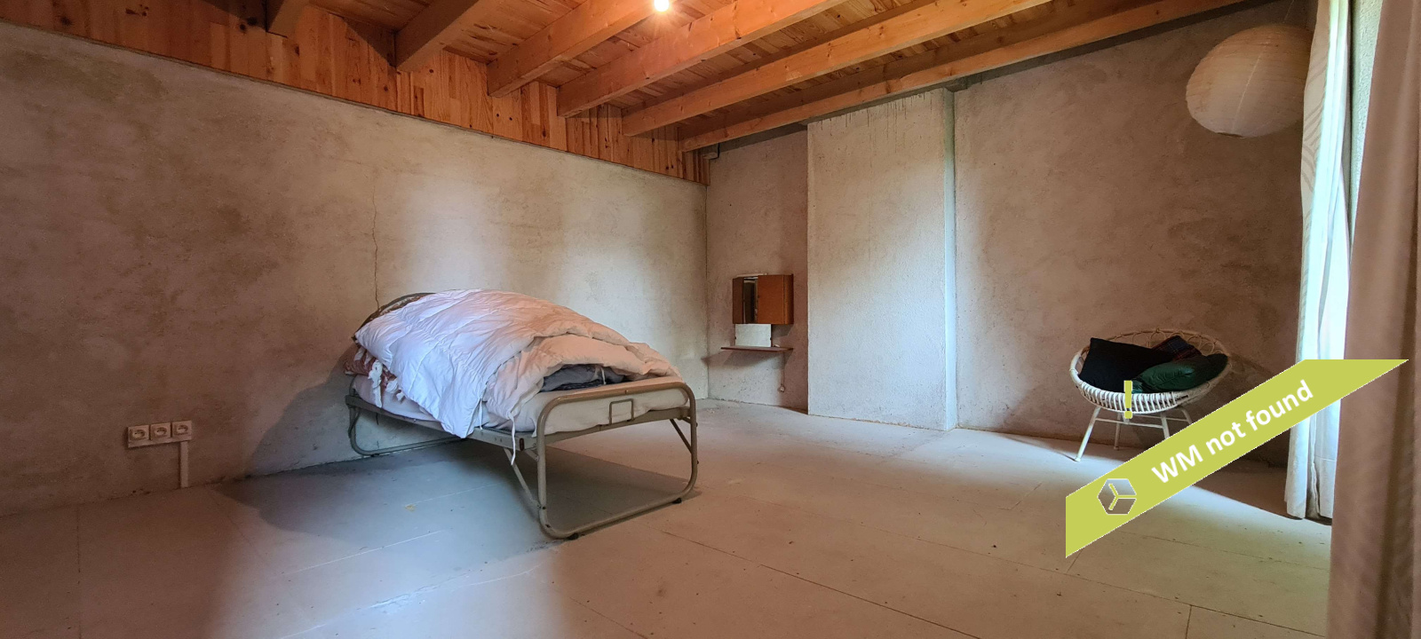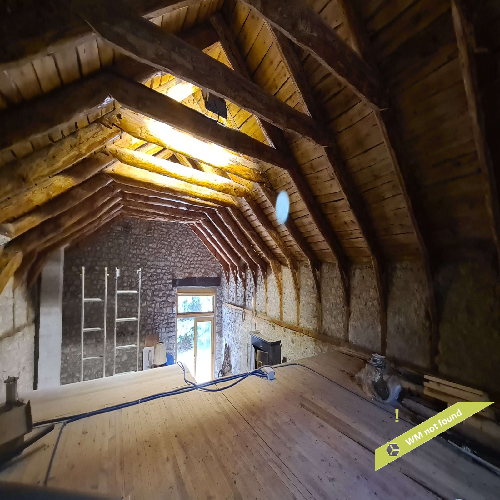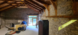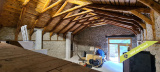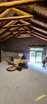 - l'étage, avec sa charpente bateau traditionnelle, est constitué par deux pièces à usage de chambres (20,26 m² et 19,47 m²), d'un vaste espace (anciennement à usage de grange) pour 68,84 m² et une hauteur d'environ 4,55 m. Au-dessus de l'espace chambres, on trouve une mezzanine de 42,83 m² au sol pour une surface habitable d'environ 25,04 m².