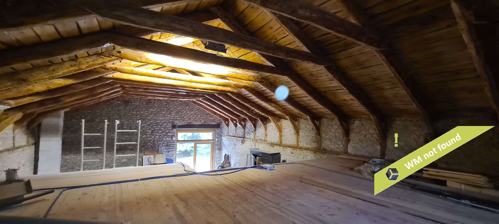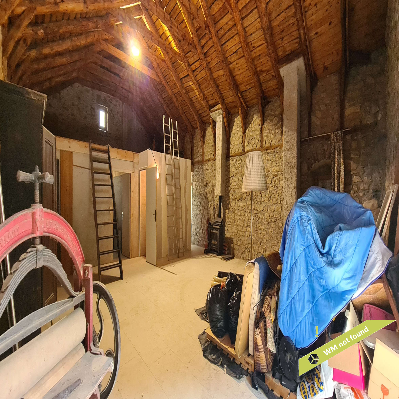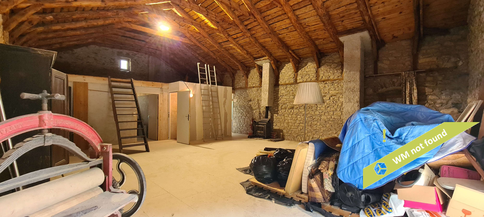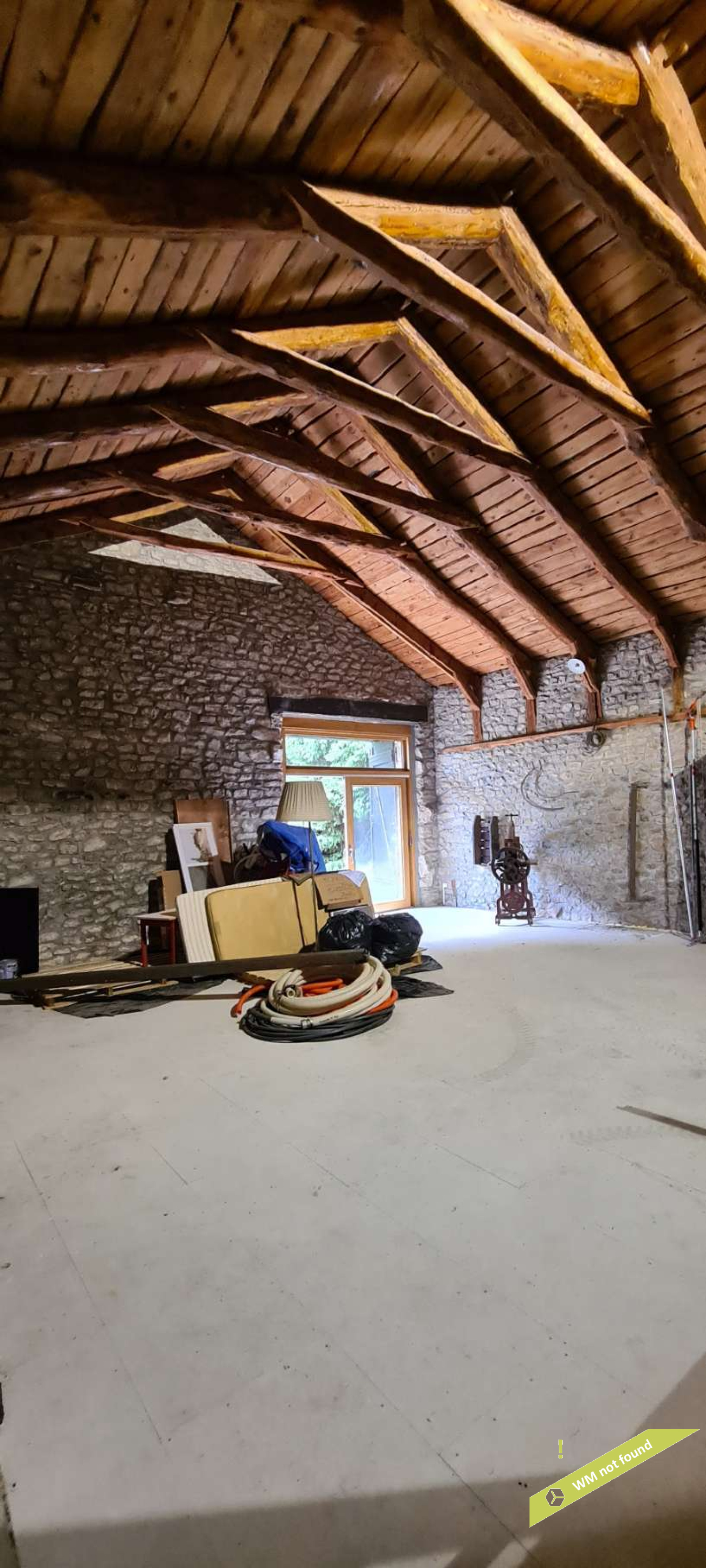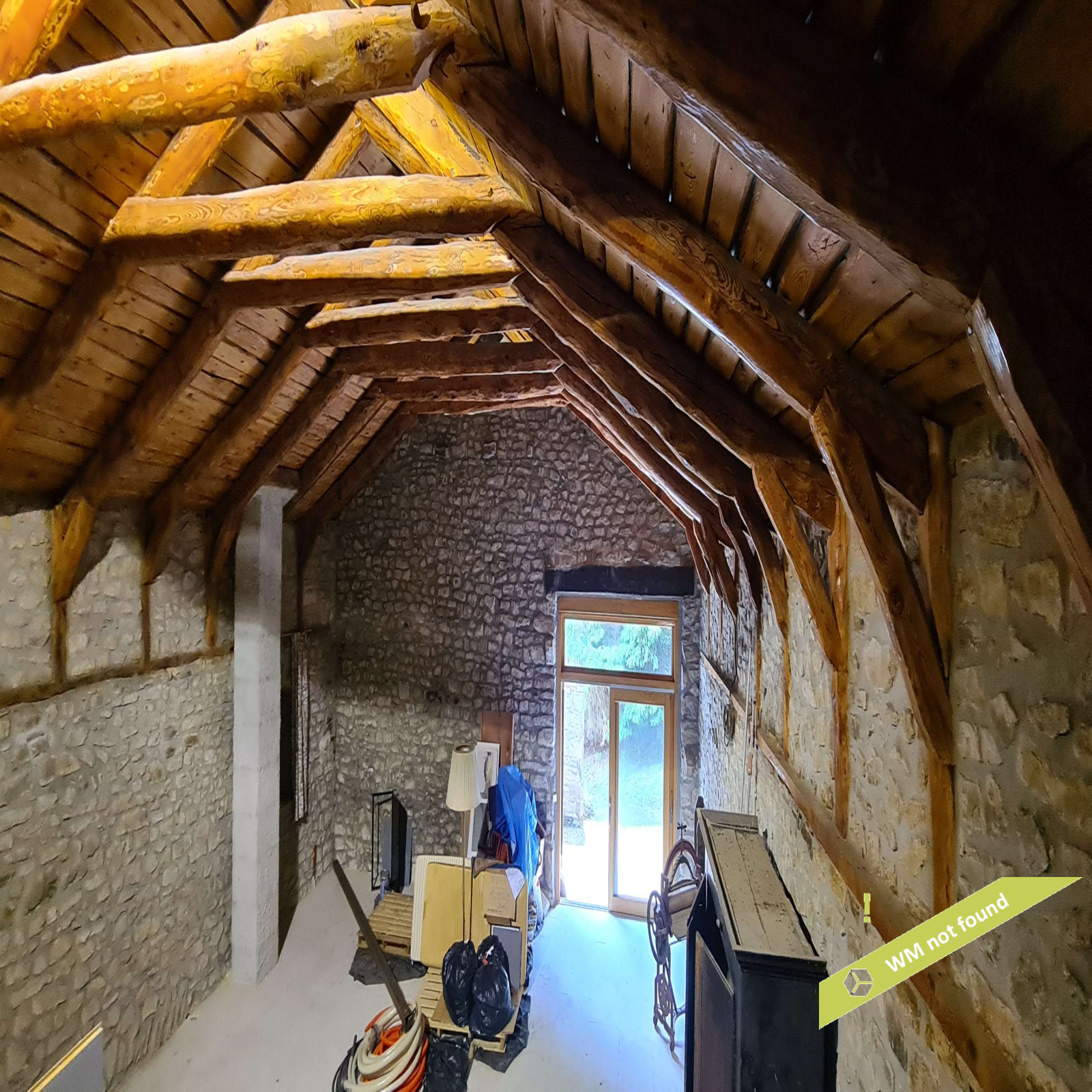 - l'étage, avec sa charpente bateau traditionnelle, est constitué par deux pièces à usage de chambres (20,26 m² et 19,47 m²), d'un vaste espace (anciennement à usage de grange) pour 68,84 m² et une hauteur d'environ 4,55 m. Au-dessus de l'espace chambres, on trouve une mezzanine de 42,83 m² au sol pour une surface habitable d'environ 25,04 m².
