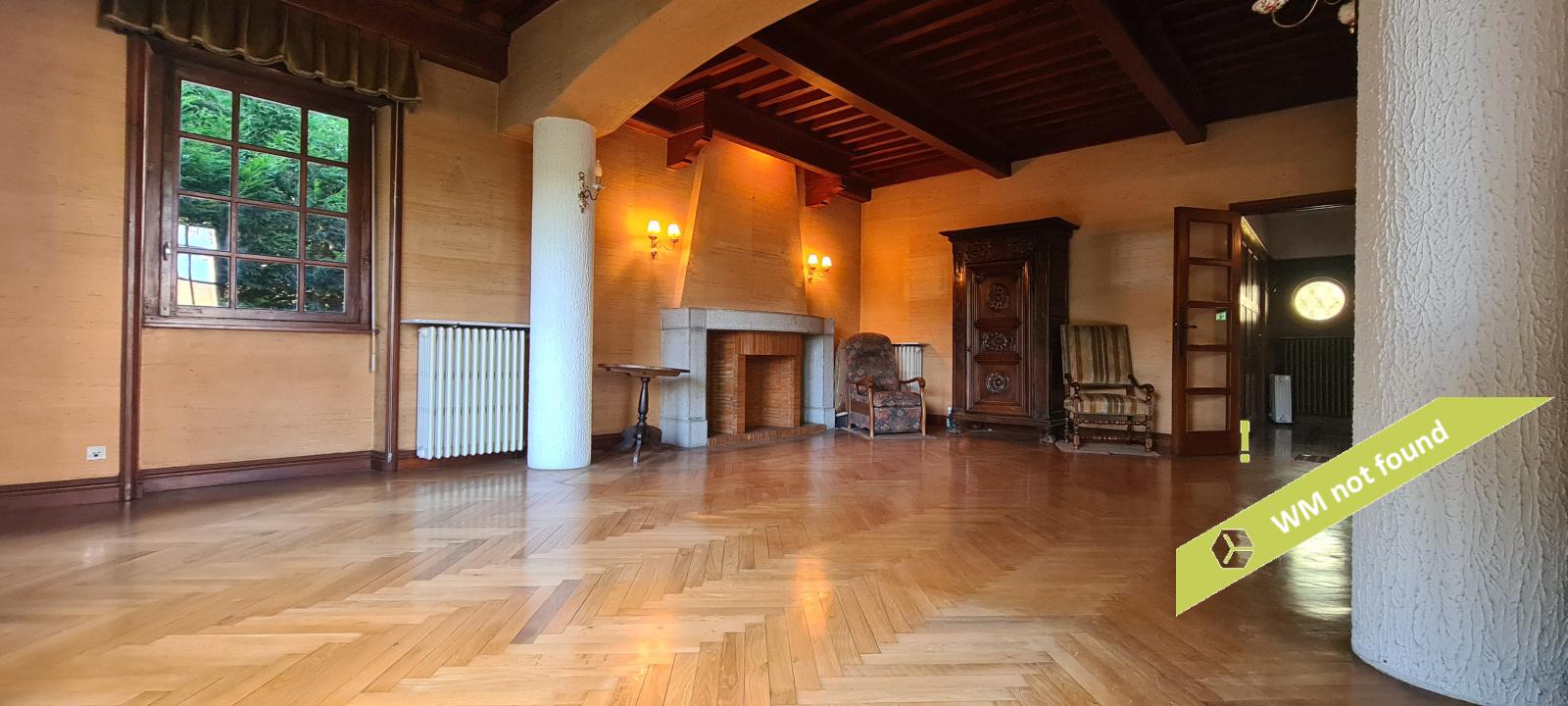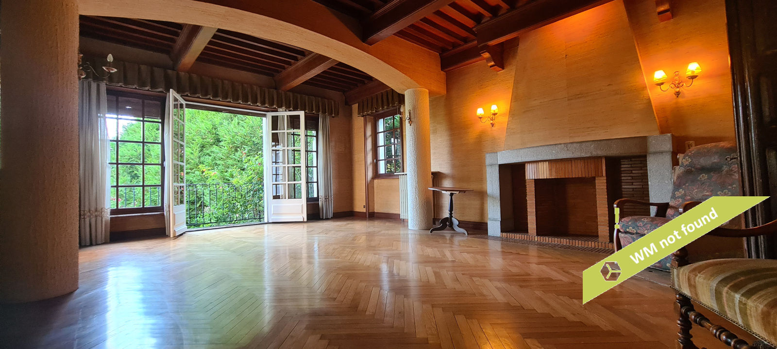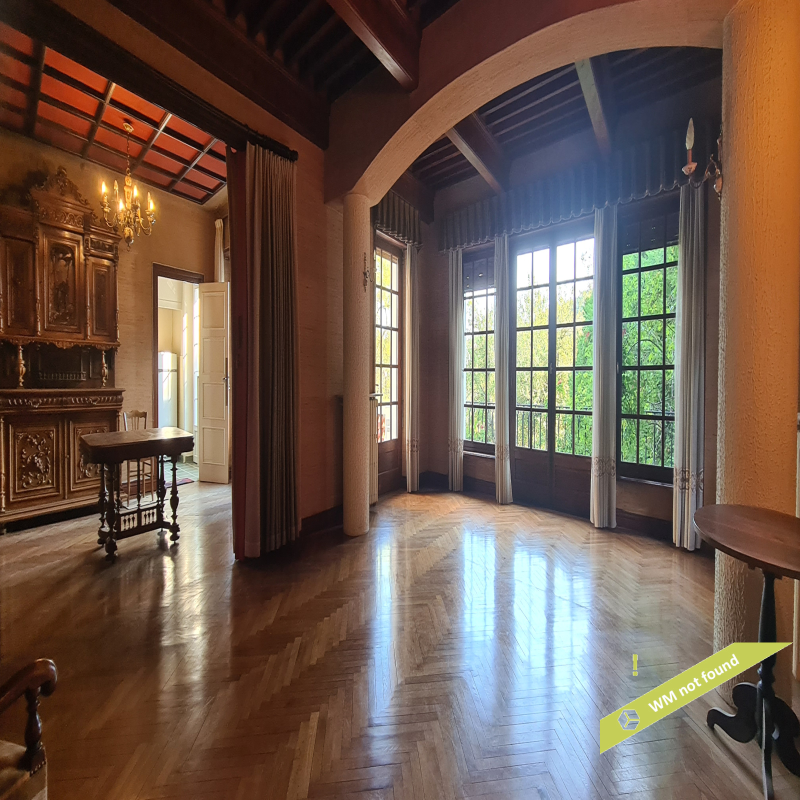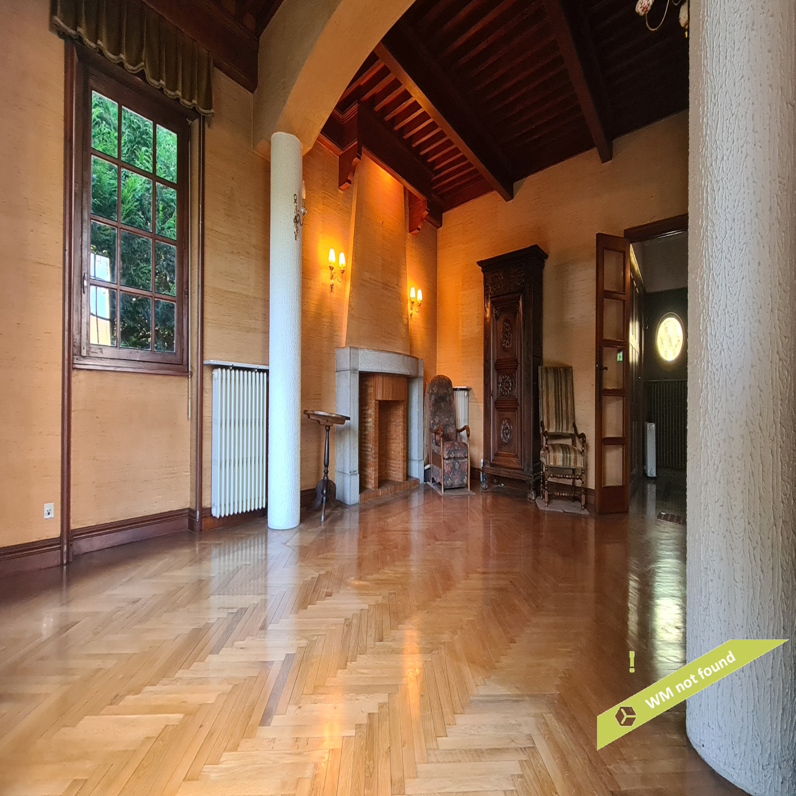 Rez-de-chaussée : le hall d’entrée (12,28 m²) dessert un bureau (16,19 m²), une pièce polyvalente (10,23 m²), une cuisine (13,36 m²), une salle-à-manger (17,54 m²) ouverte sur un vaste salon (40,48 m²) avec parquet d’origine et plafond à la française. Ces pièces donnent accès à un balcon filant de 26,79 m² surplombant le jardin. Une salle d’eau avec WC complète ce niveau.