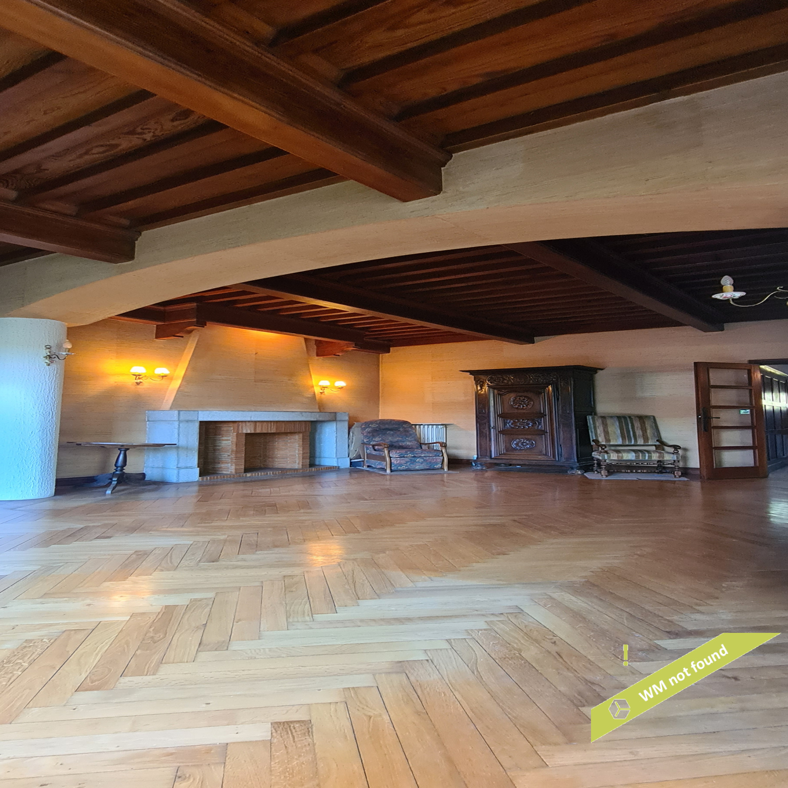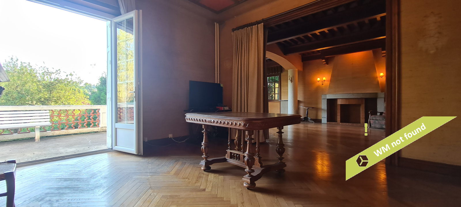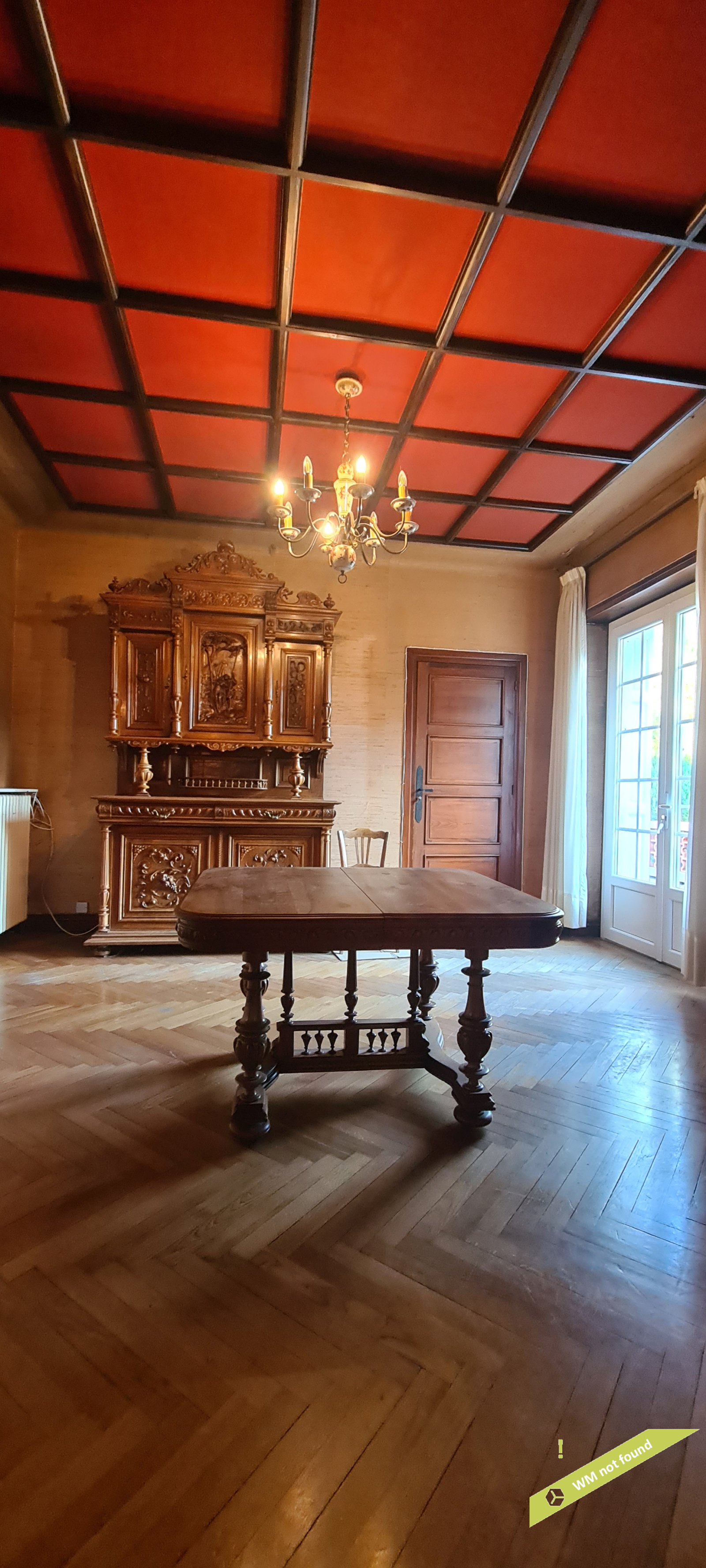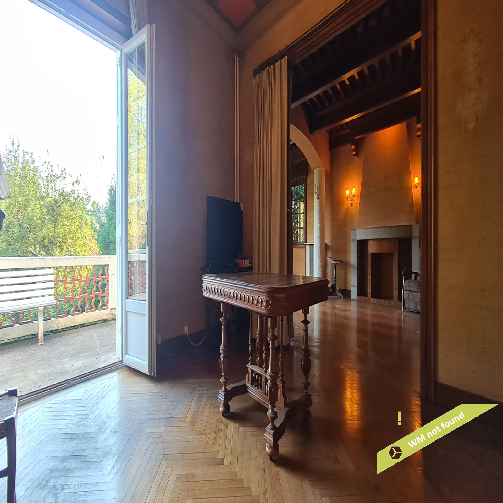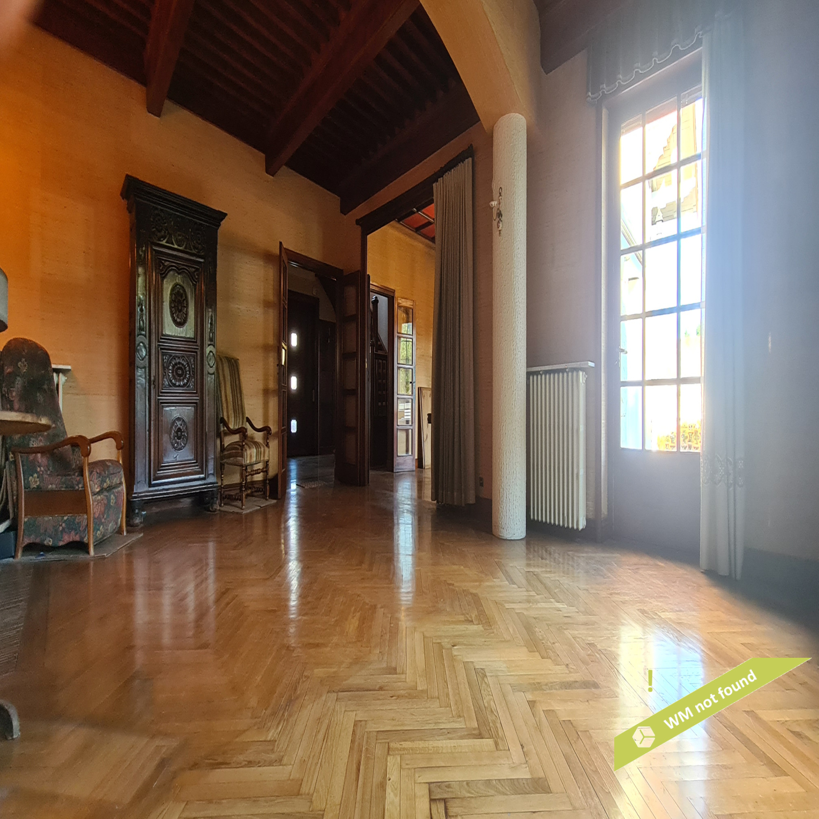Rez-de-chaussée : le hall d’entrée (12,28 m²) dessert un bureau (16,19 m²), une pièce polyvalente (10,23 m²), une cuisine (13,36 m²), une salle-à-manger (17,54 m²) ouverte sur un vaste salon (40,48 m²) avec parquet d’origine et plafond à la française. Ces pièces donnent accès à un balcon filant de 26,79 m² surplombant le jardin. Une salle d’eau avec WC complète ce niveau.