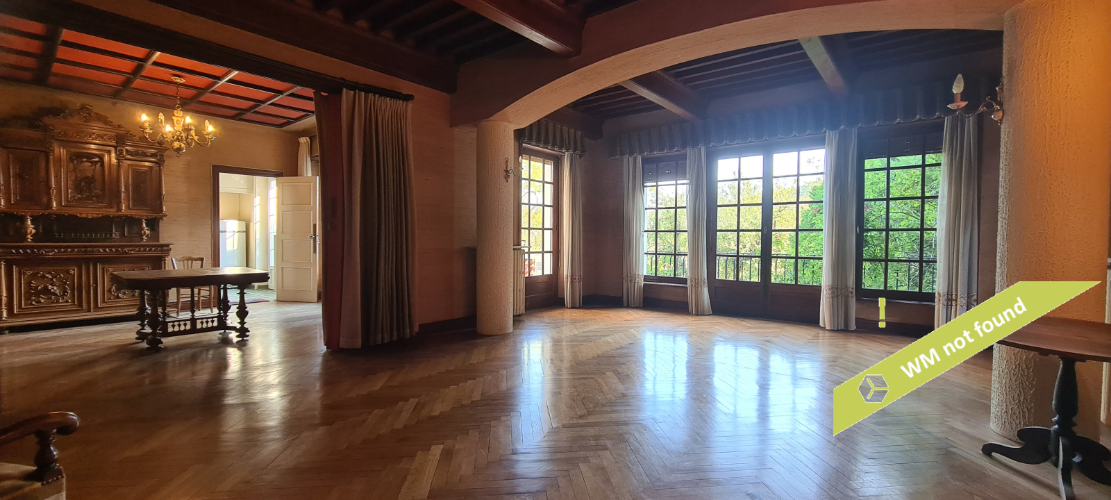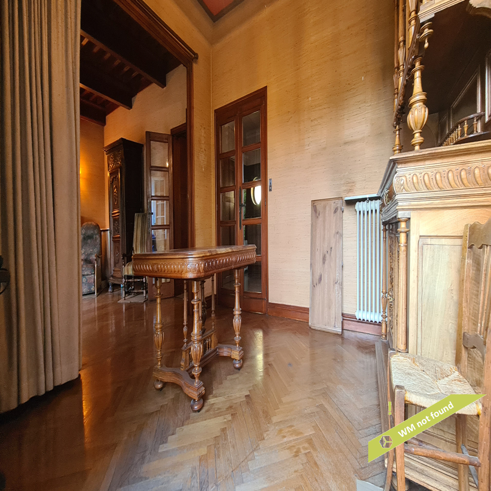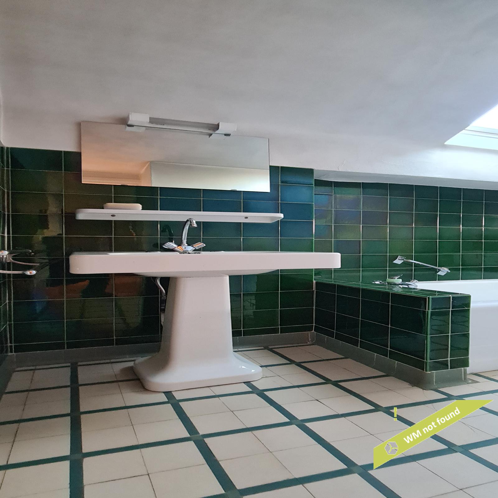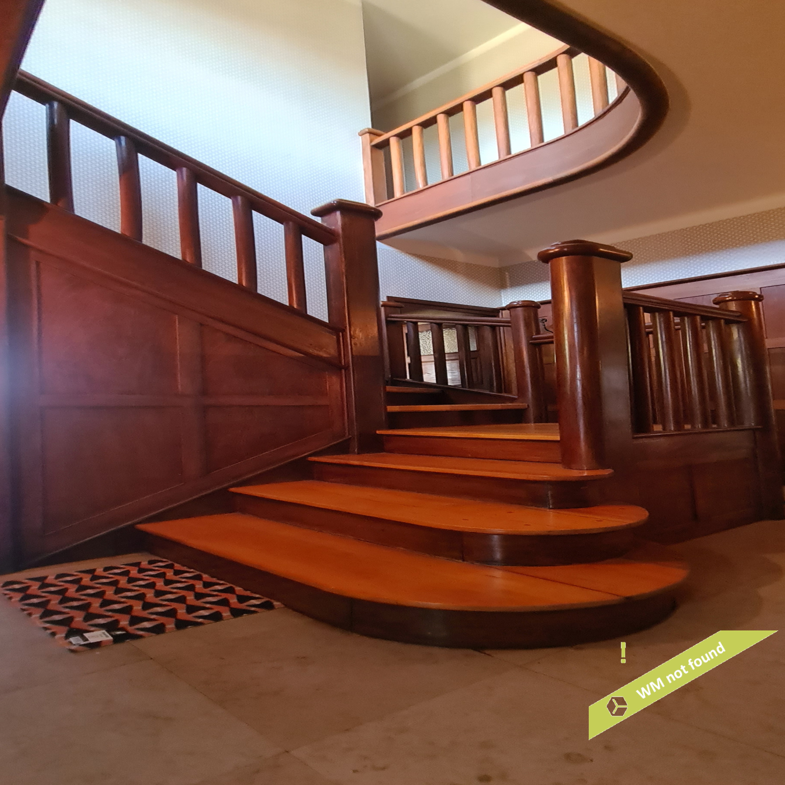 Rez-de-chaussée : le hall d’entrée (12,28 m²) dessert un bureau (16,19 m²), une pièce polyvalente (10,23 m²), une cuisine (13,36 m²), une salle-à-manger (17,54 m²) ouverte sur un vaste salon (40,48 m²) avec parquet d’origine et plafond à la française. Ces pièces donnent accès à un balcon filant de 26,79 m² surplombant le jardin. Une salle d’eau avec WC complète ce niveau.