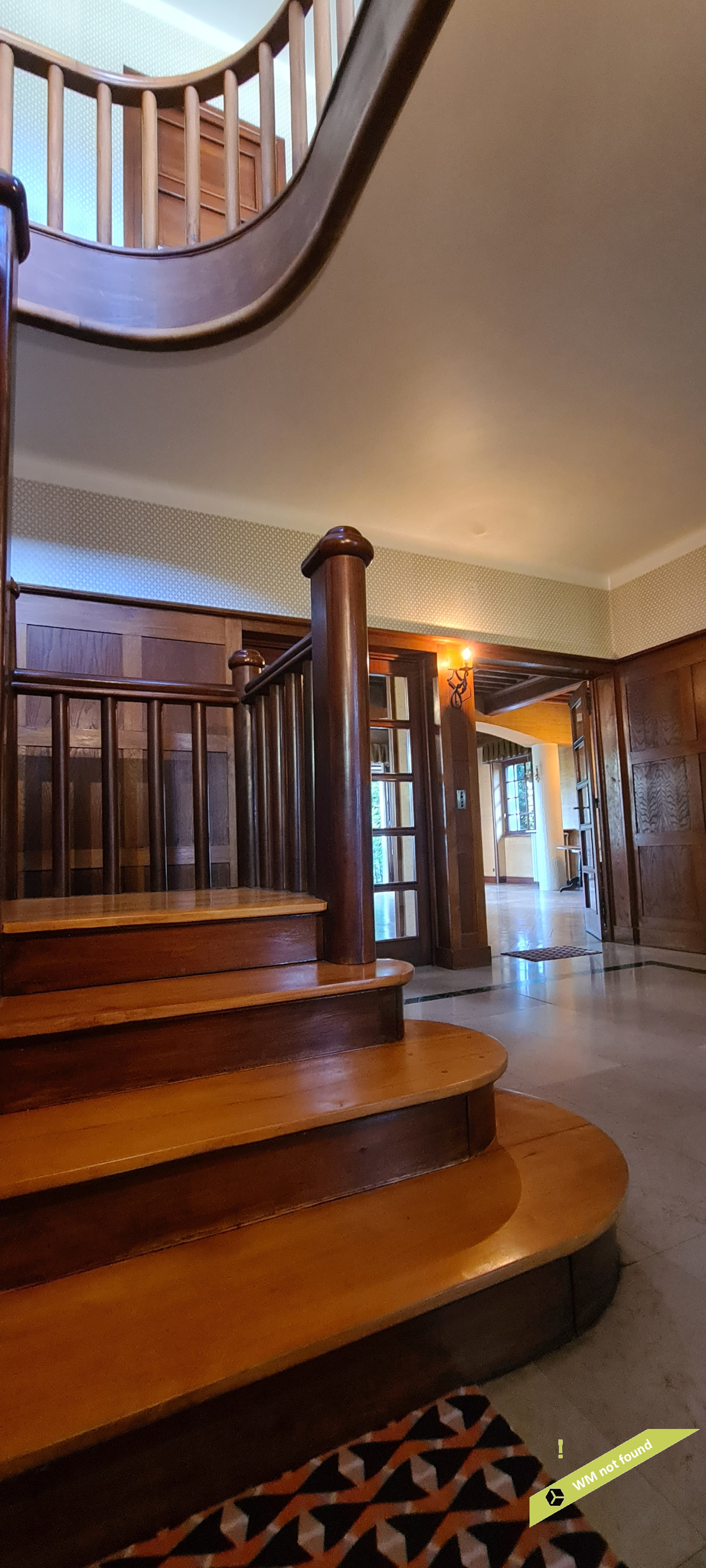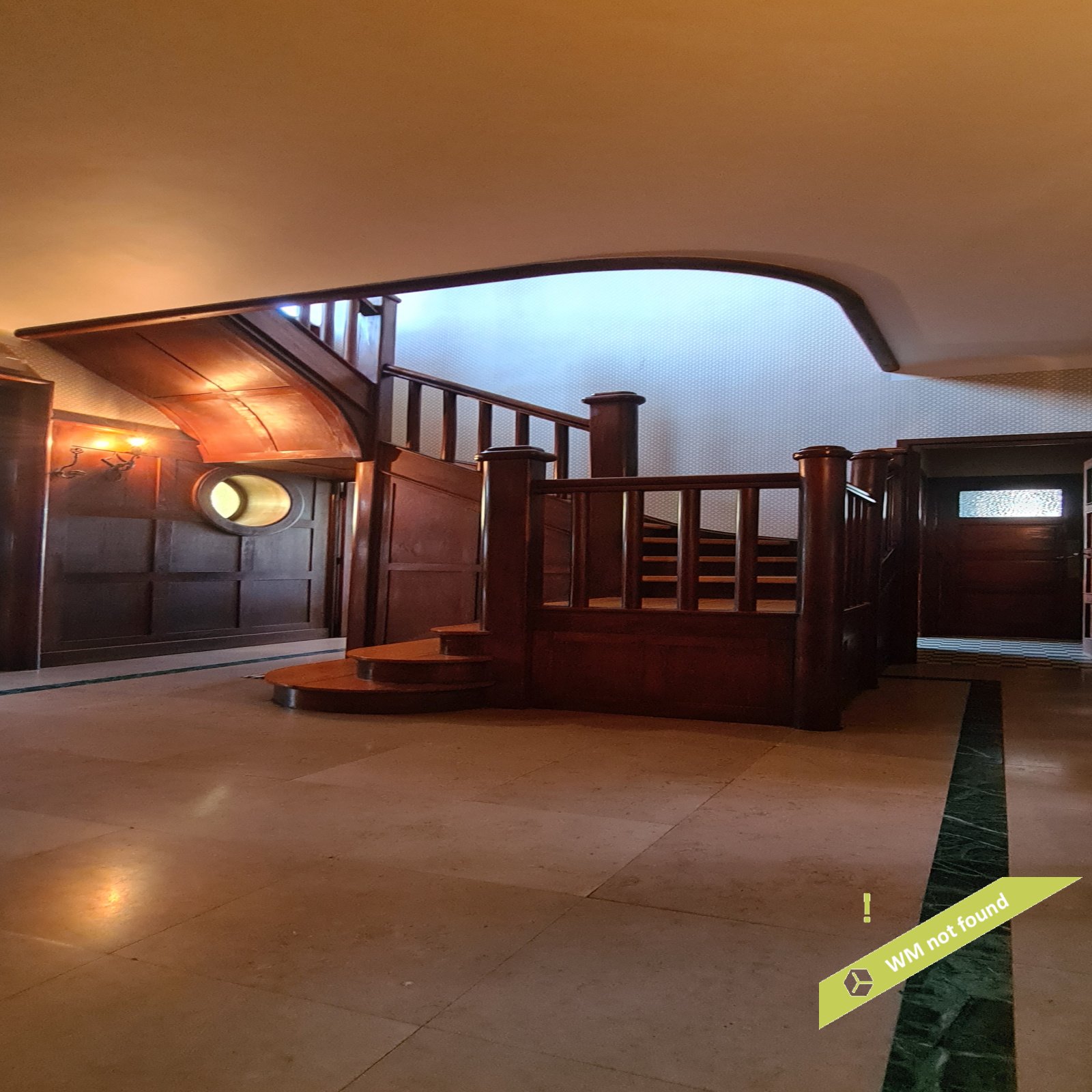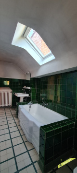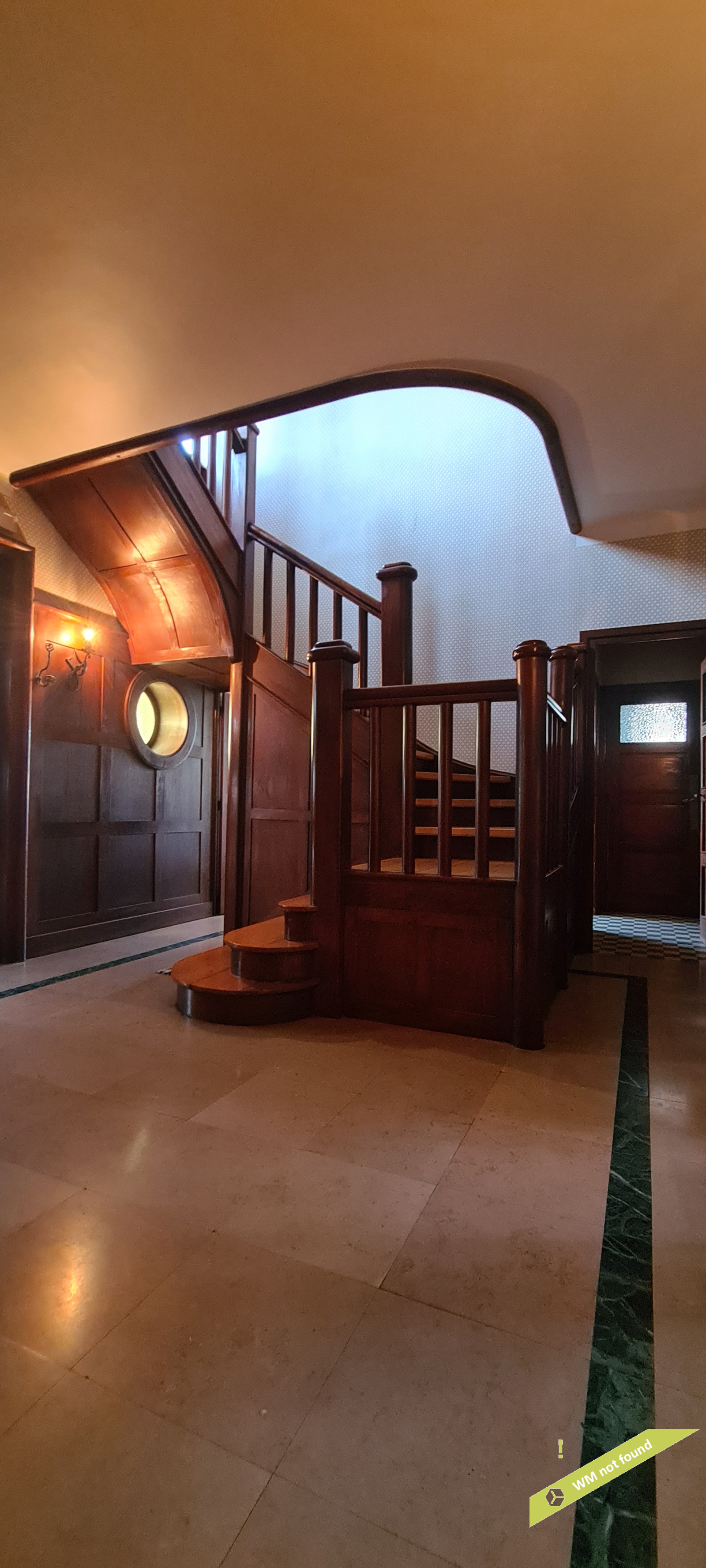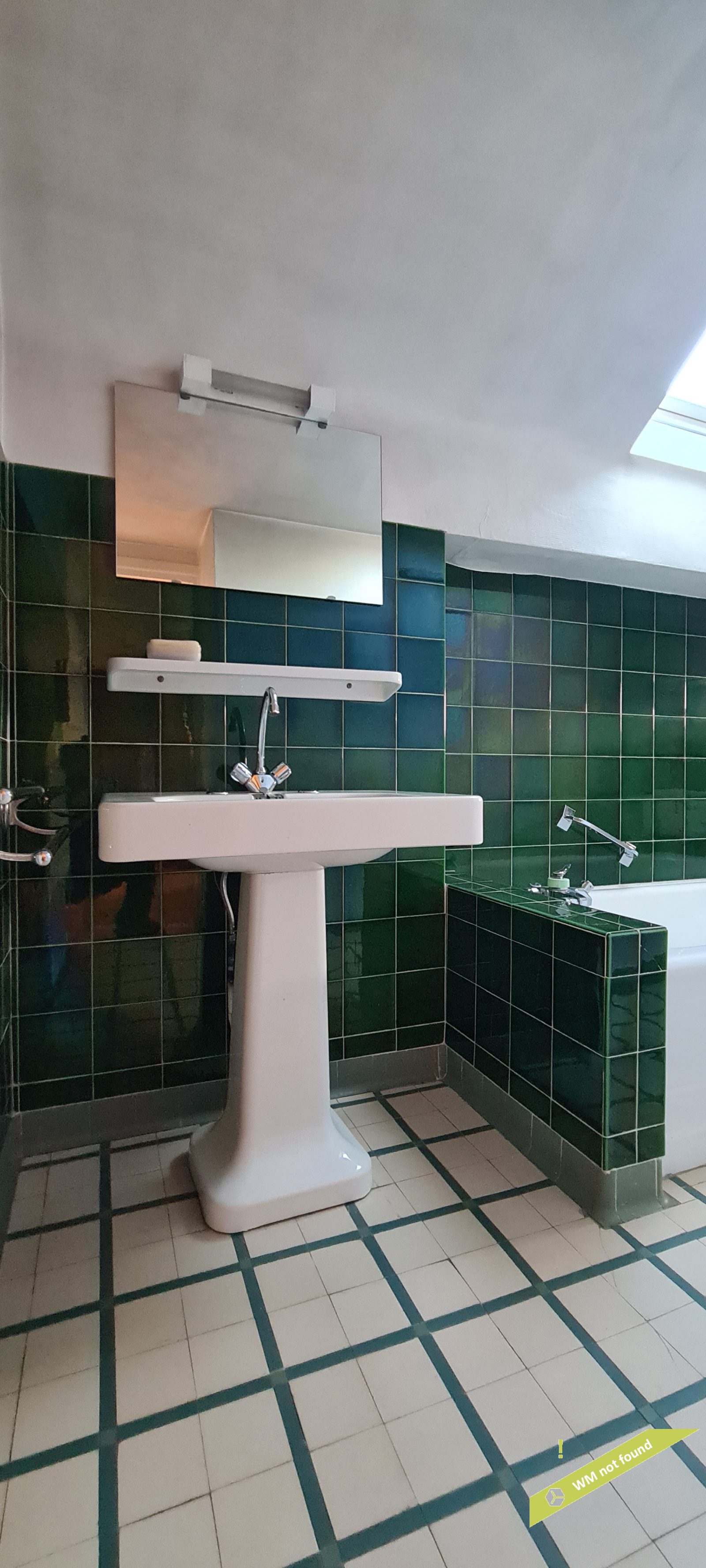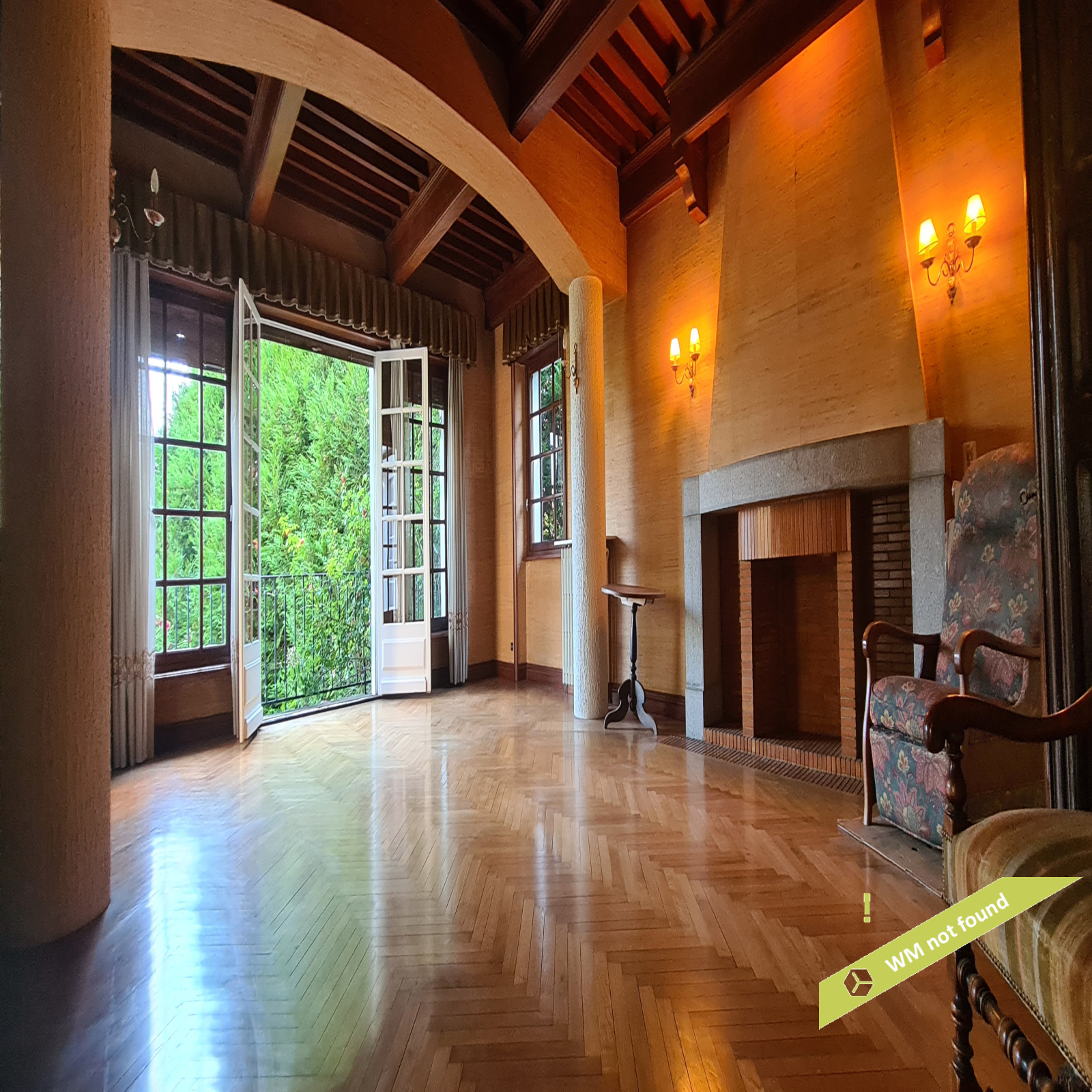 Rez-de-chaussée : le hall d’entrée (12,28 m²) dessert un bureau (16,19 m²), une pièce polyvalente (10,23 m²), une cuisine (13,36 m²), une salle-à-manger (17,54 m²) ouverte sur un vaste salon (40,48 m²) avec parquet d’origine et plafond à la française. Ces pièces donnent accès à un balcon filant de 26,79 m² surplombant le jardin. Une salle d’eau avec WC complète ce niveau.
