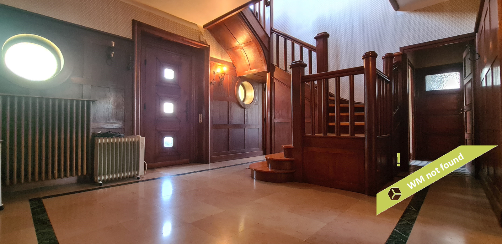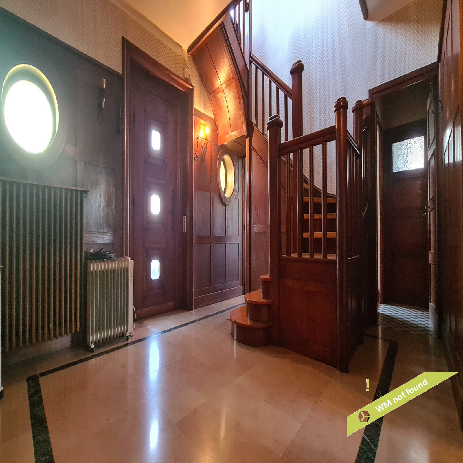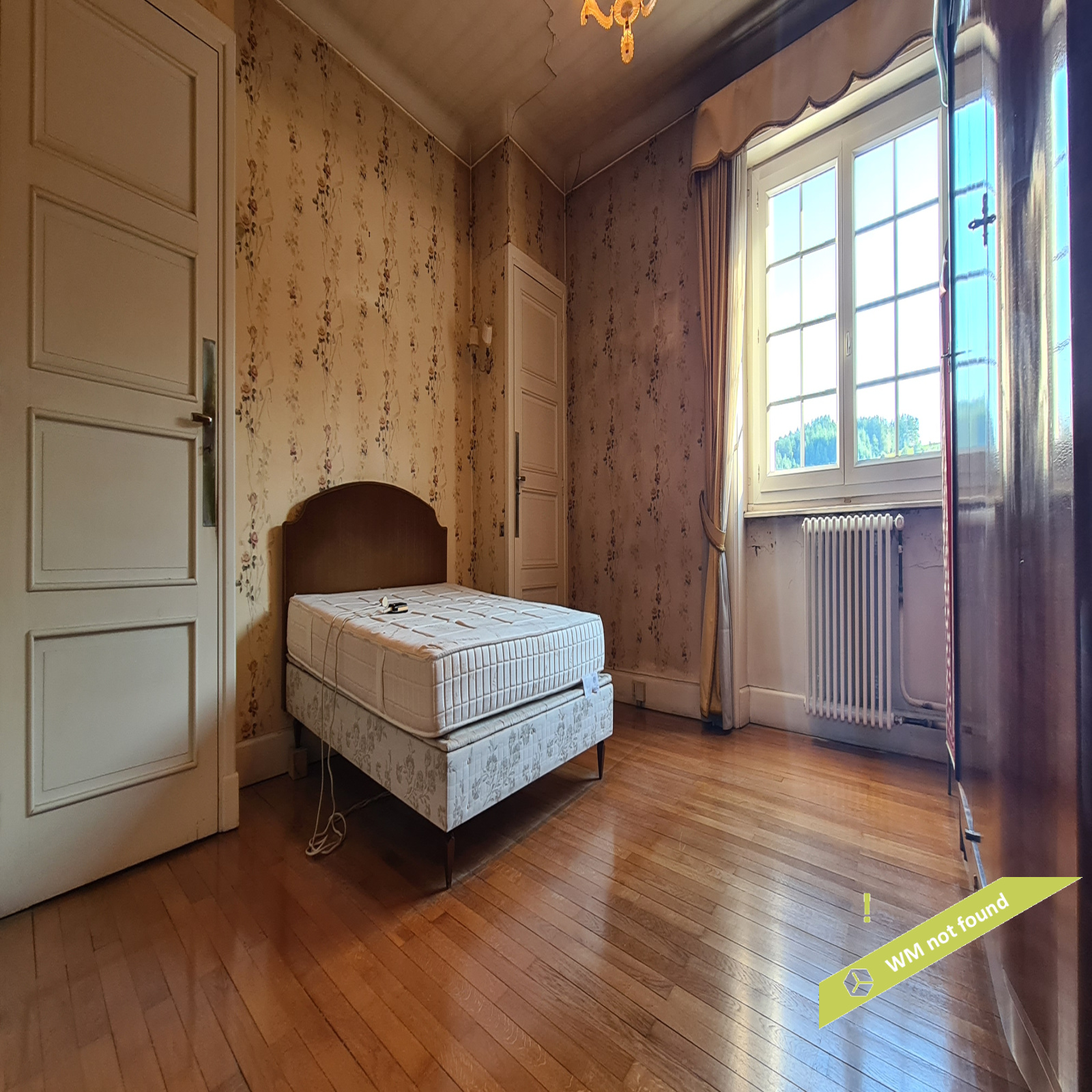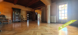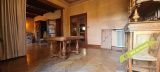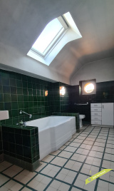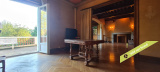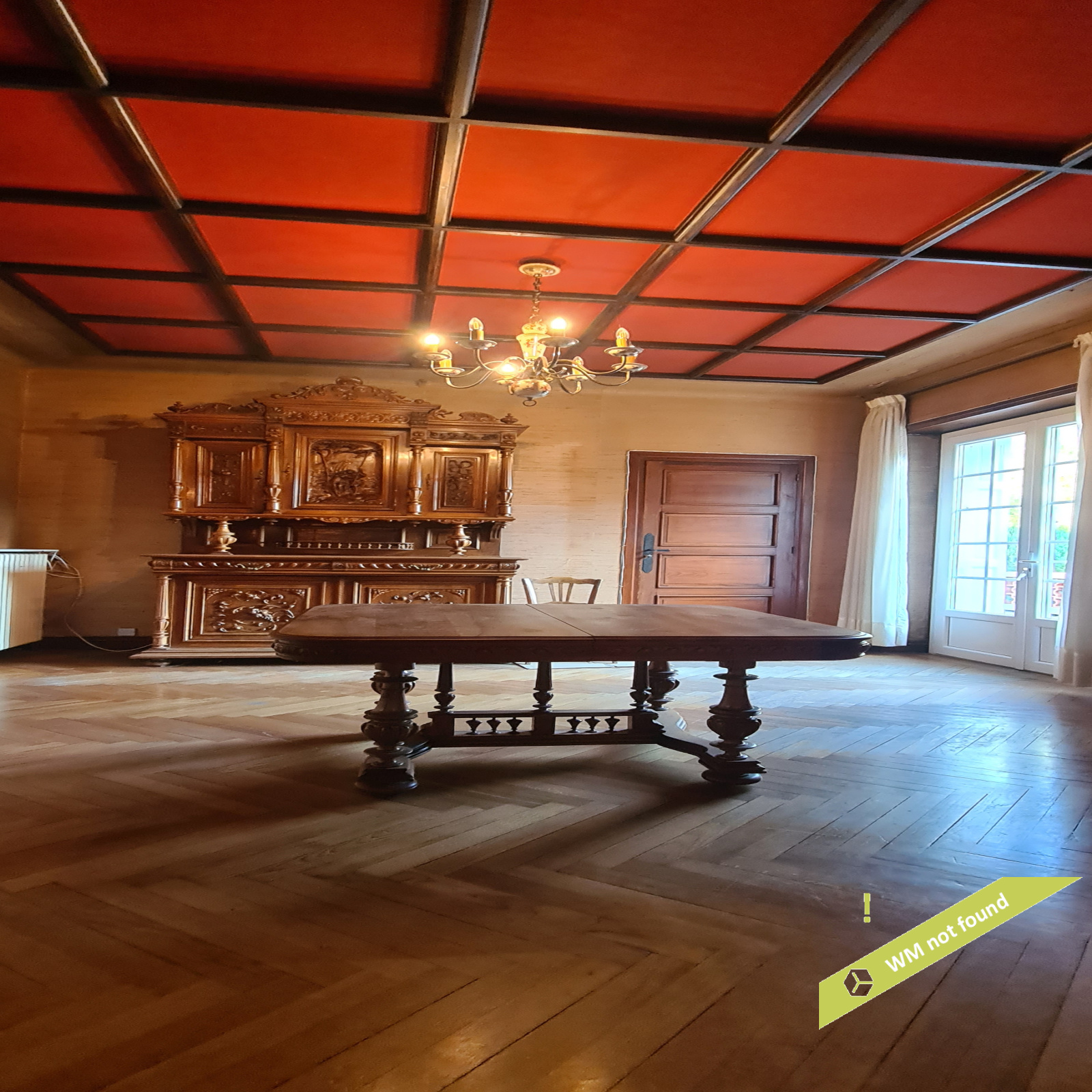 Rez-de-chaussée : le hall d’entrée (12,28 m²) dessert un bureau (16,19 m²), une pièce polyvalente (10,23 m²), une cuisine (13,36 m²), une salle-à-manger (17,54 m²) ouverte sur un vaste salon (40,48 m²) avec parquet d’origine et plafond à la française. Ces pièces donnent accès à un balcon filant de 26,79 m² surplombant le jardin. Une salle d’eau avec WC complète ce niveau.