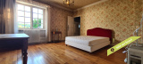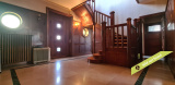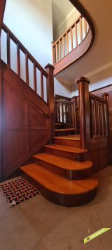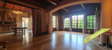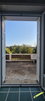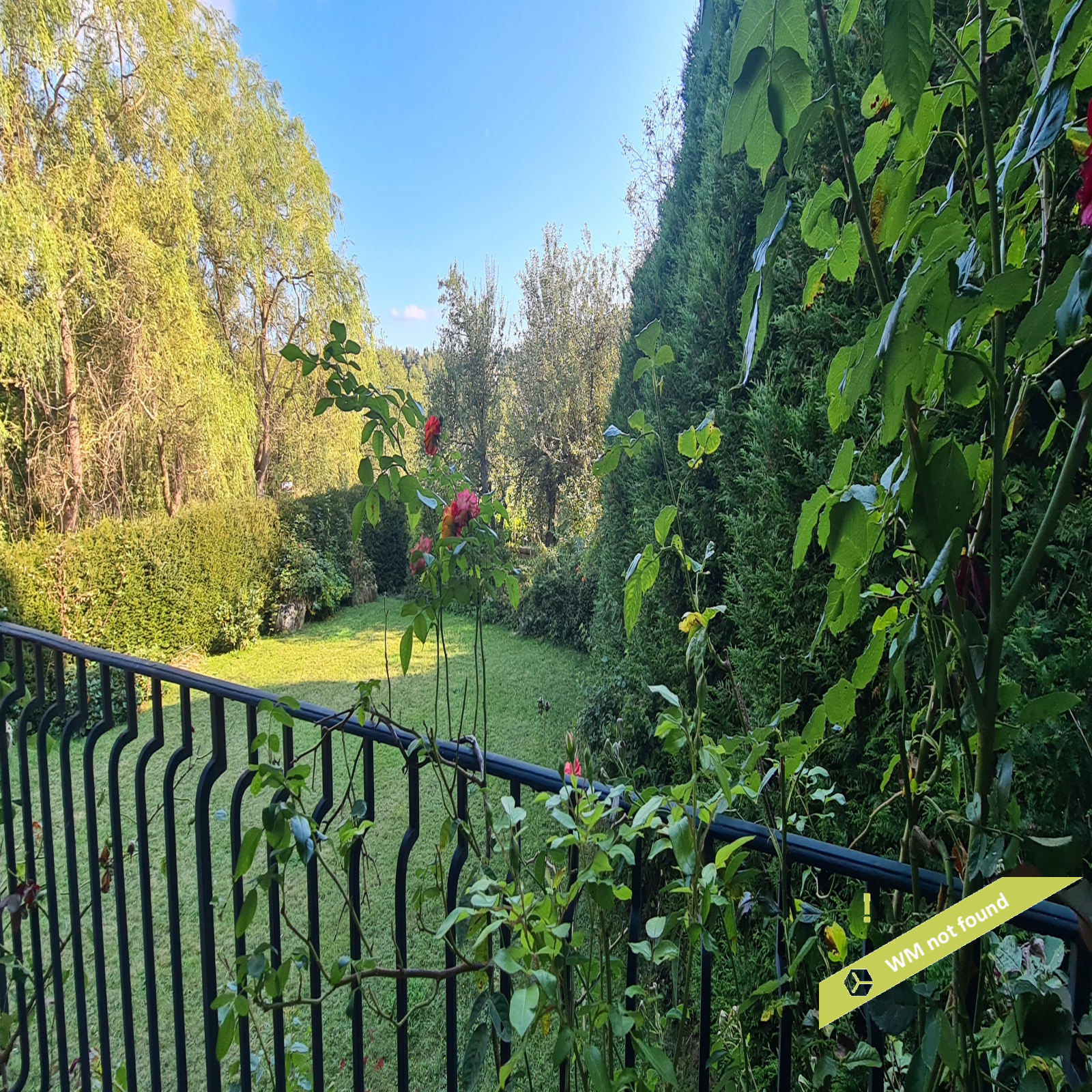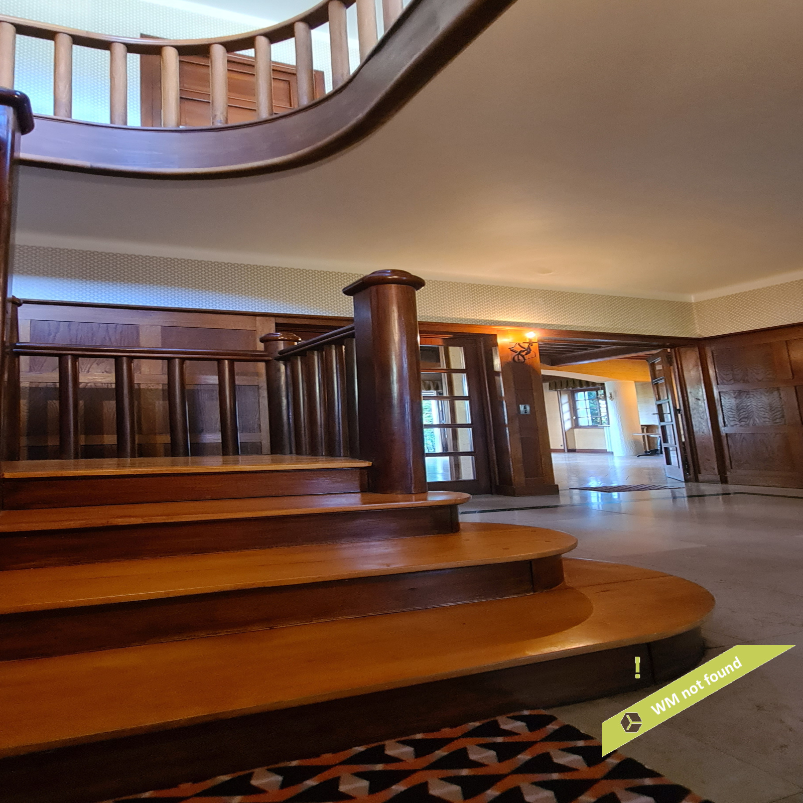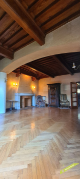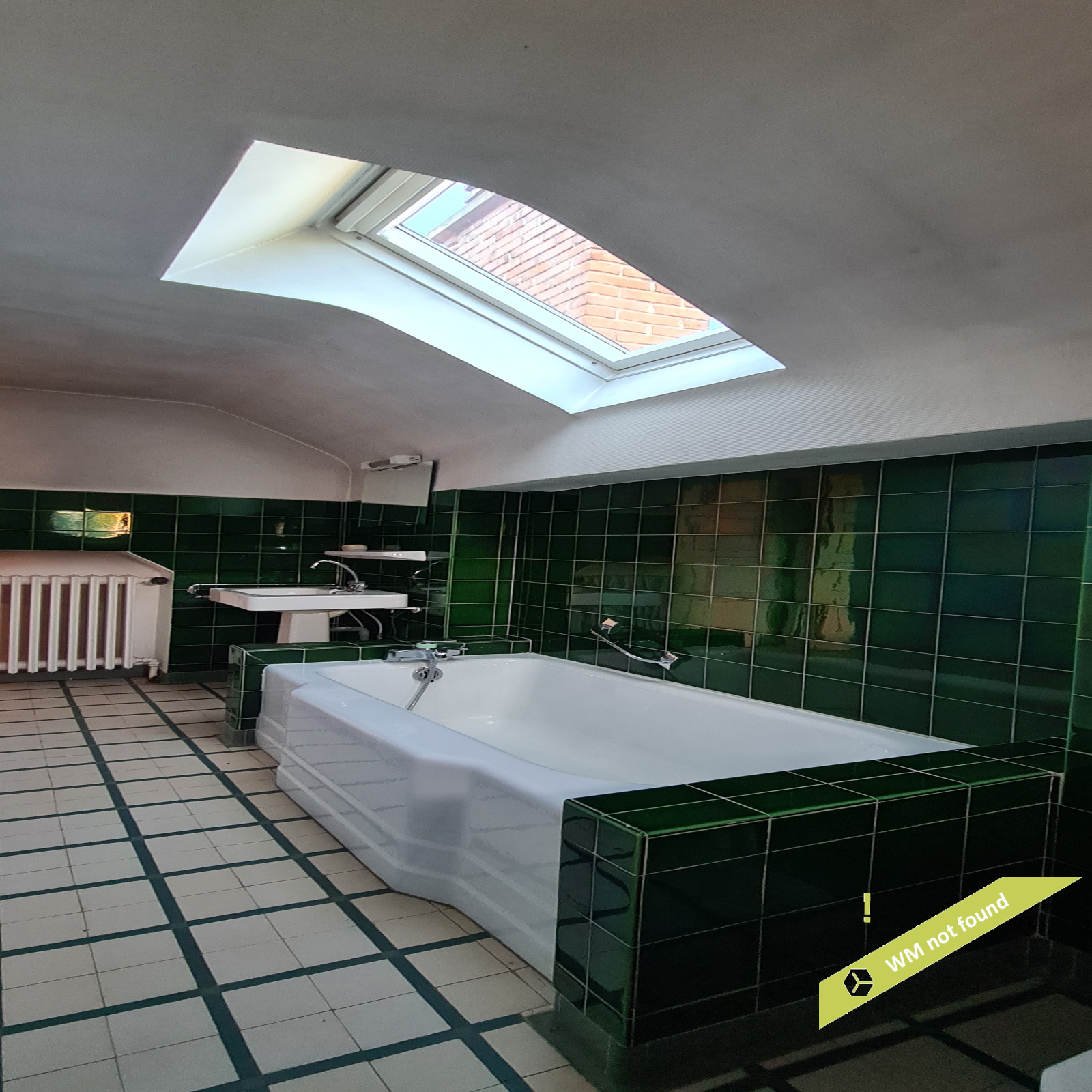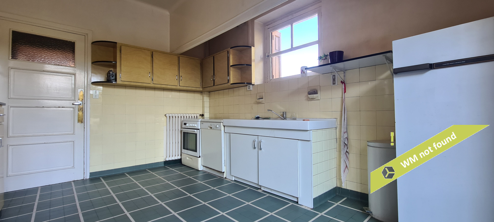 Rez-de-chaussée : le hall d’entrée (12,28 m²) dessert un bureau (16,19 m²), une pièce polyvalente (10,23 m²), une cuisine (13,36 m²), une salle-à-manger (17,54 m²) ouverte sur un vaste salon (40,48 m²) avec parquet d’origine et plafond à la française. Ces pièces donnent accès à un balcon filant de 26,79 m² surplombant le jardin. Une salle d’eau avec WC complète ce niveau.