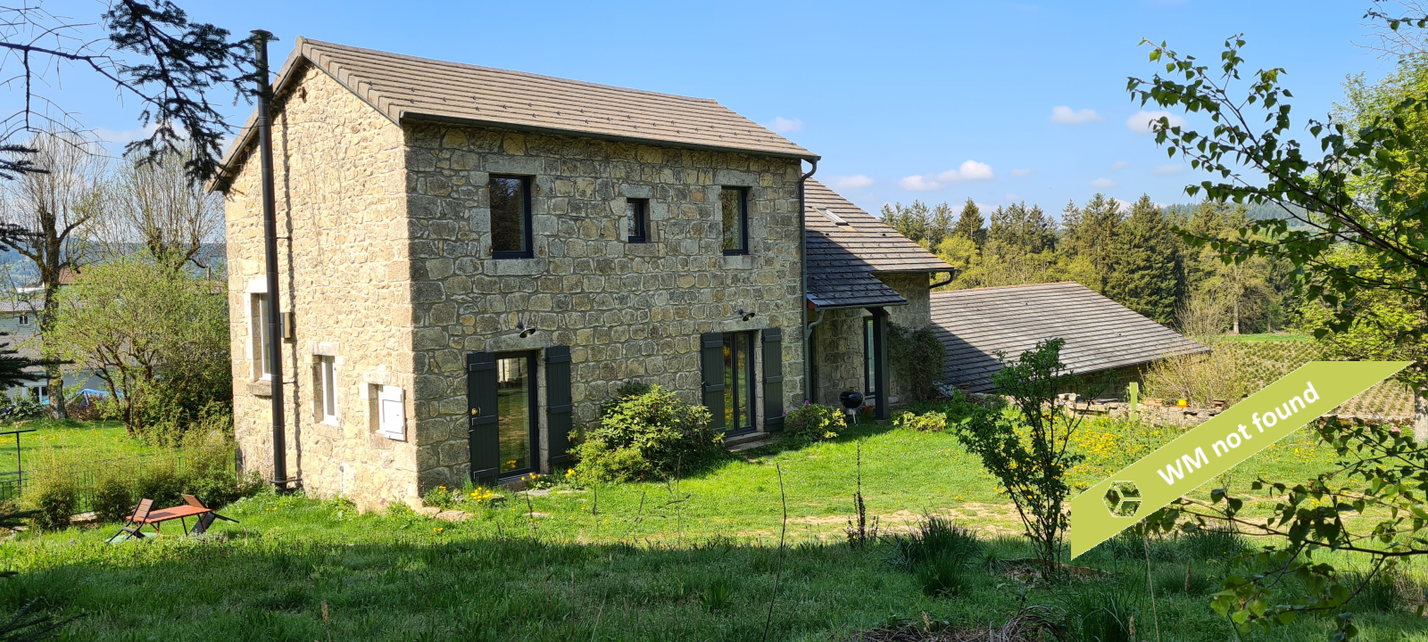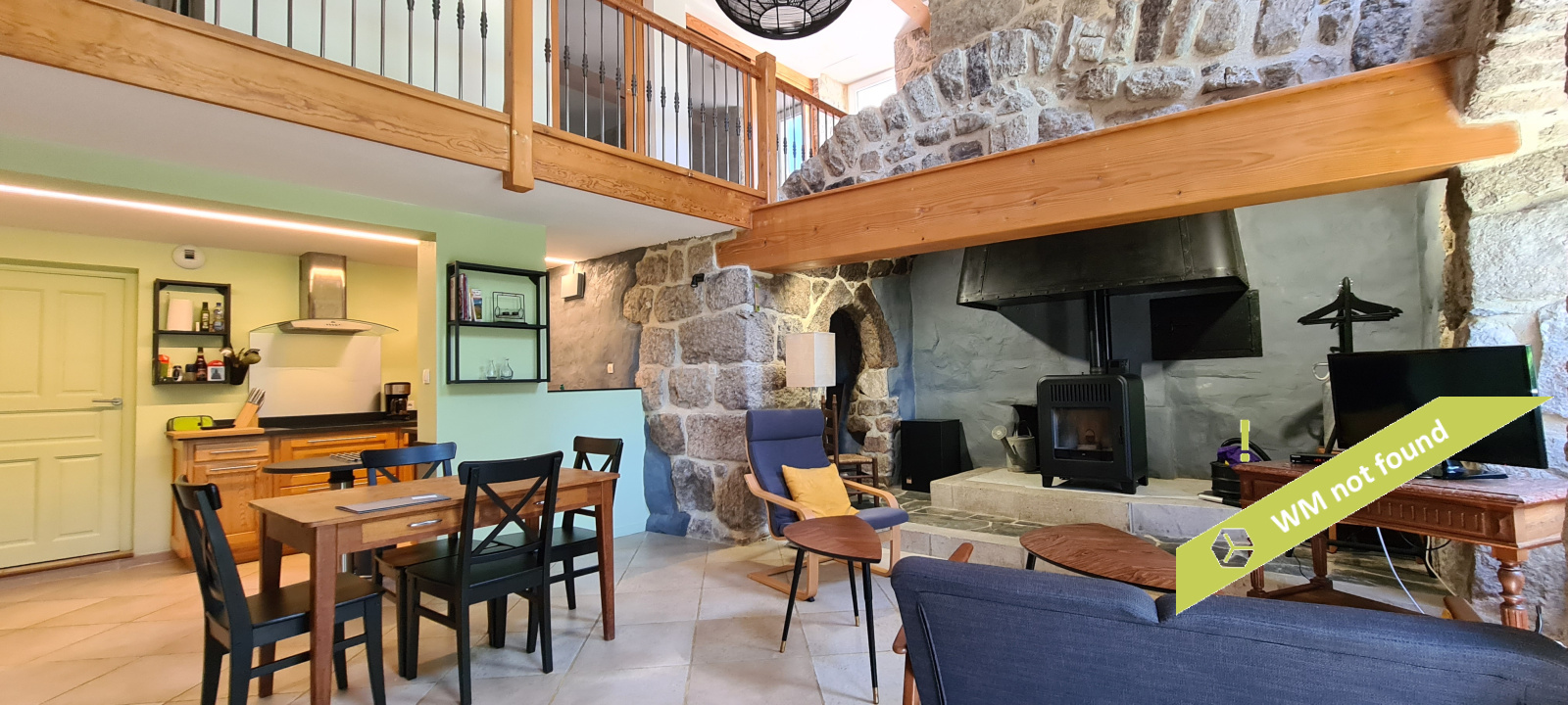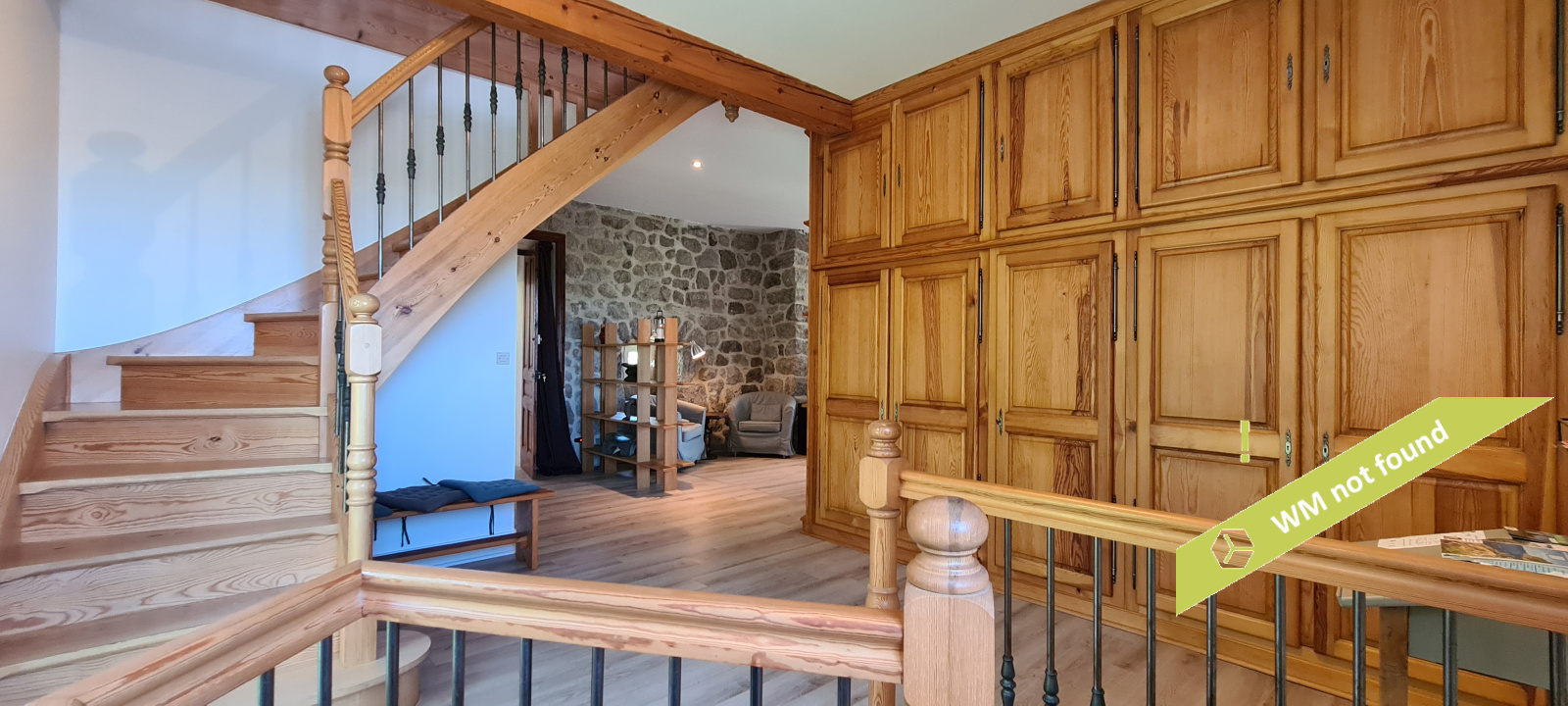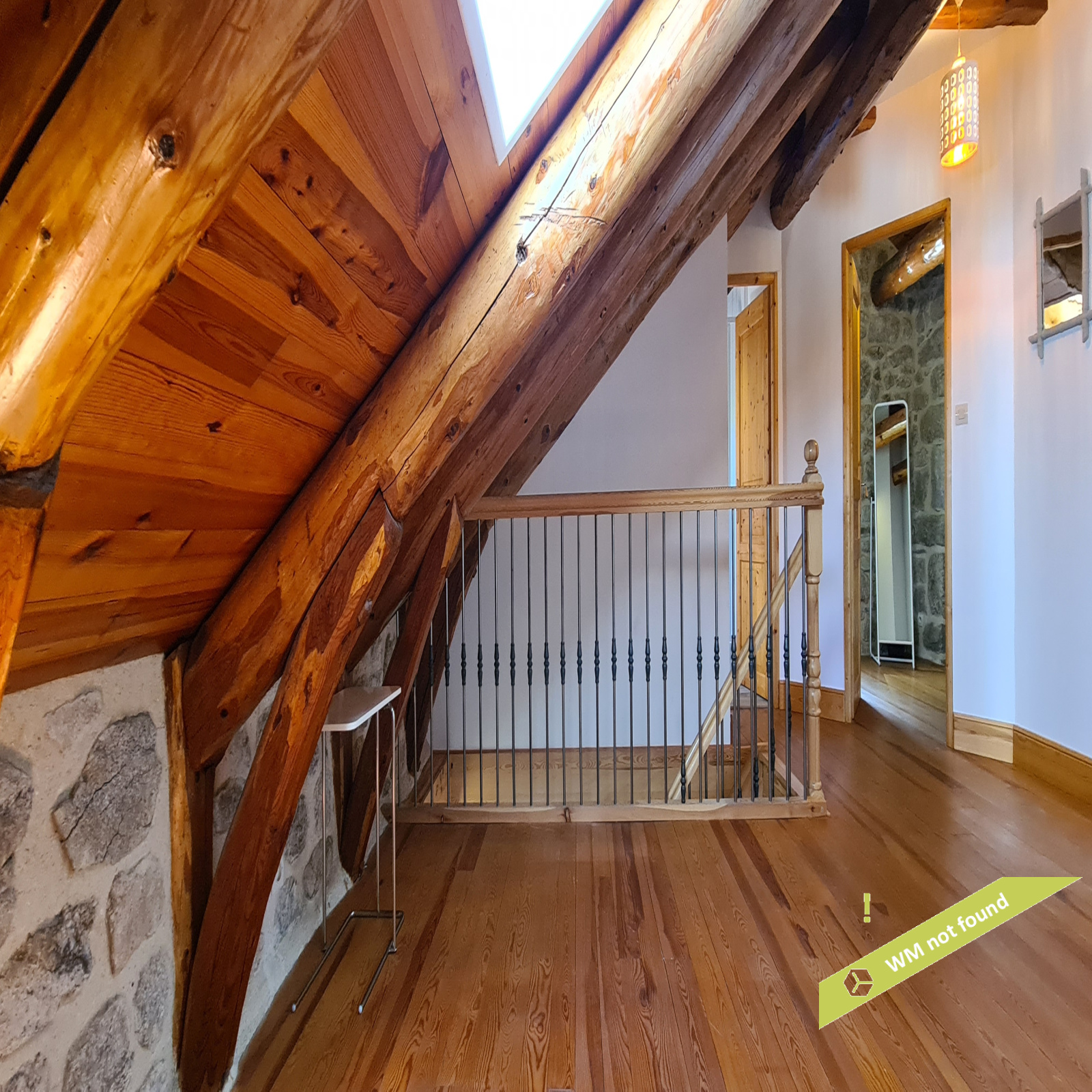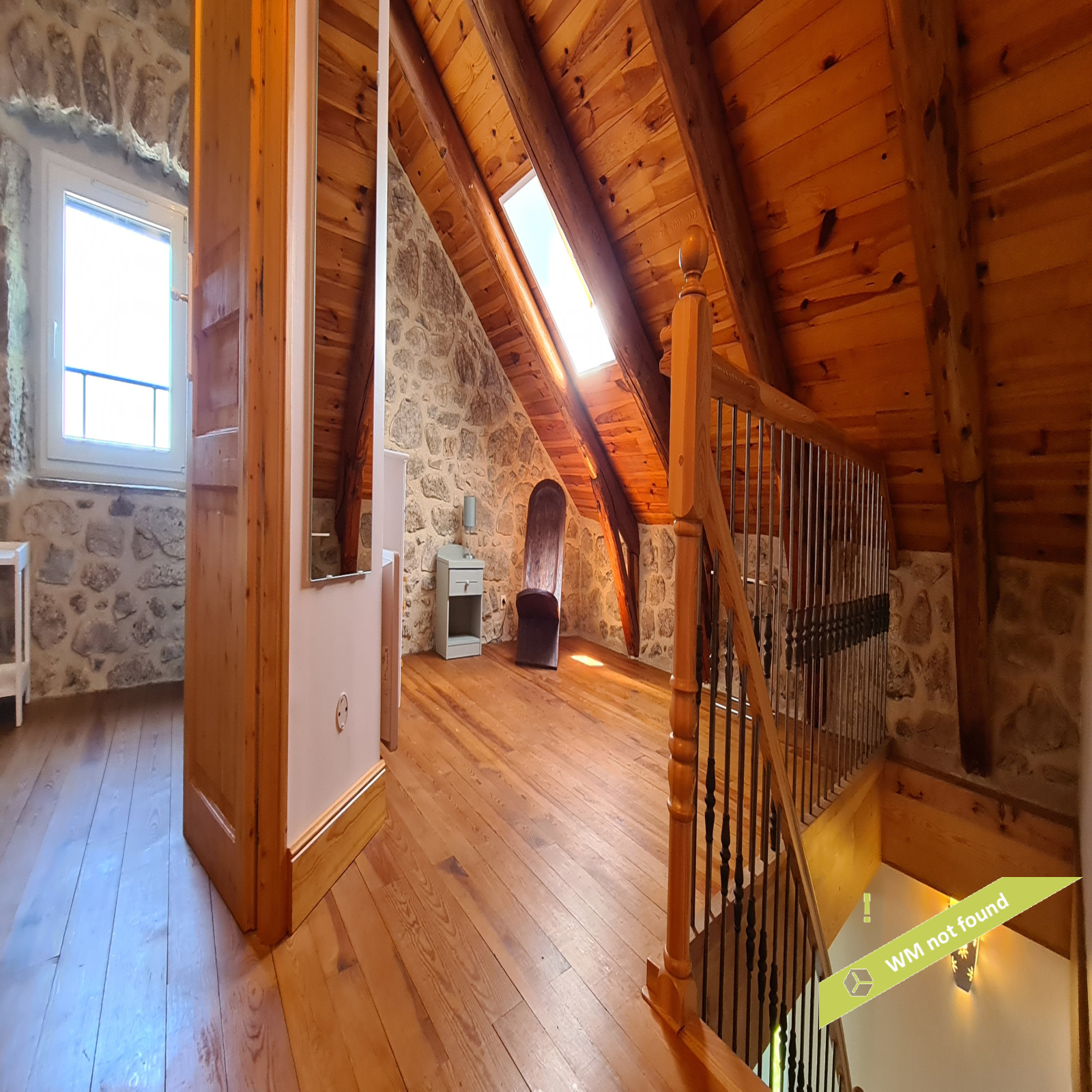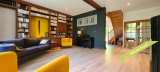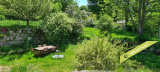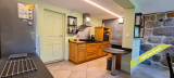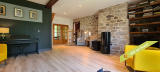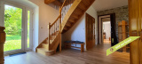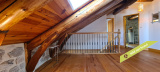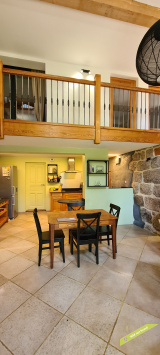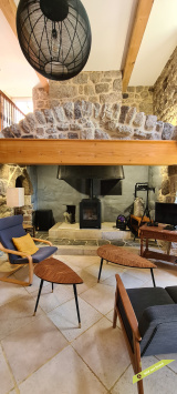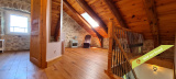 - La 2ème partie est accessible également depuis la salle-à-manger de la 1ère partie. On y trouve un vaste hall avec placards en bois massif (10,70 m²), un salon (38,47 m²), un petit bureau avec placards (3,37 m²). L'étage compte 2 chambres mansardées (11,13 m² et 12,20 m²), une salle de bains avec douche et baignoire et un wc. Quelques escaliers plus bas, on arrive sur une coursive (7,01 m²) permettant d'accéder à une chambre avec salle d'eau et wc (17,81 m²) et à une terrasse. Le rez-de-chaussée enfin accueille une cuisine ouverte sur la salle-à-manger (43,13 m²) avec son magnifique cantou, un cellier et un wc.