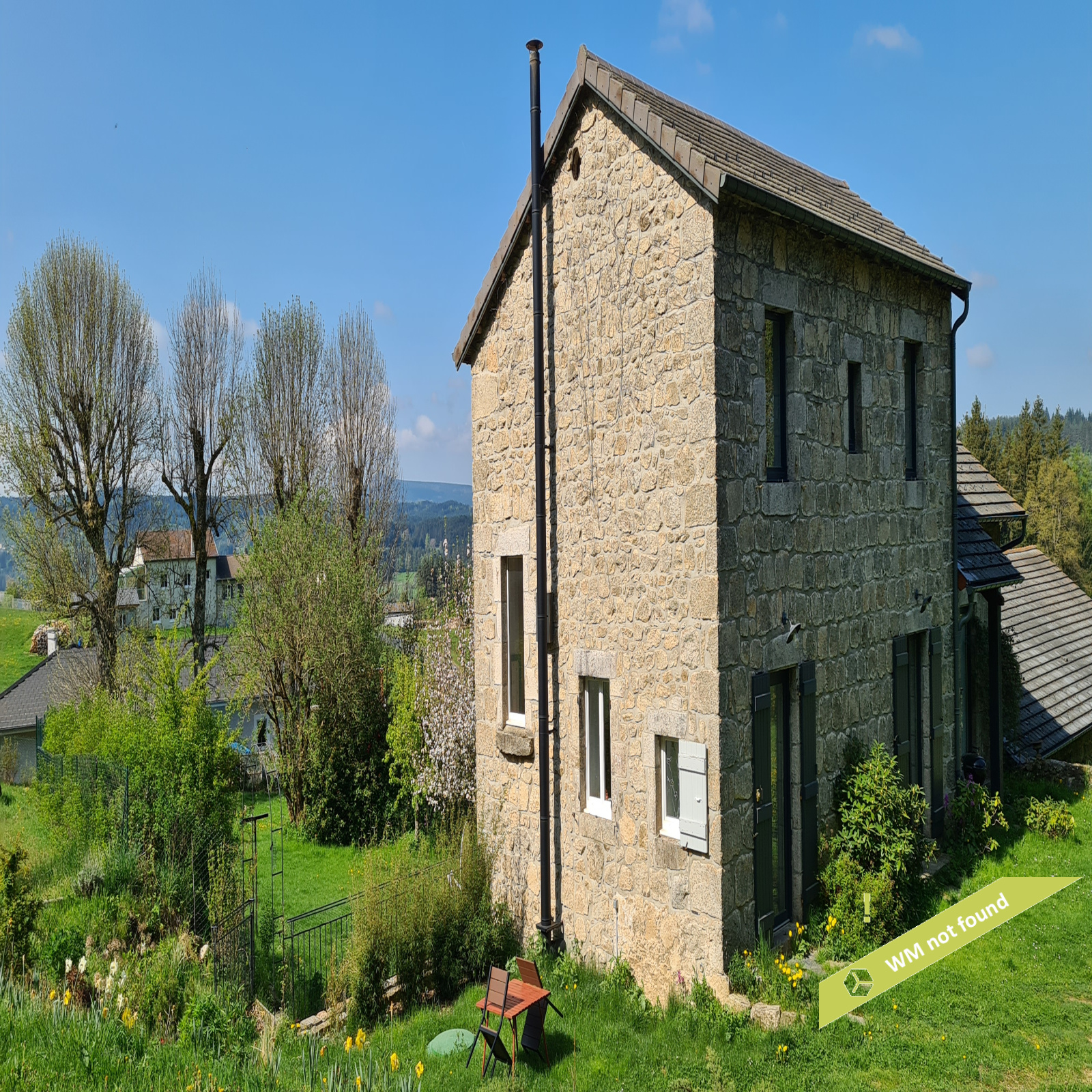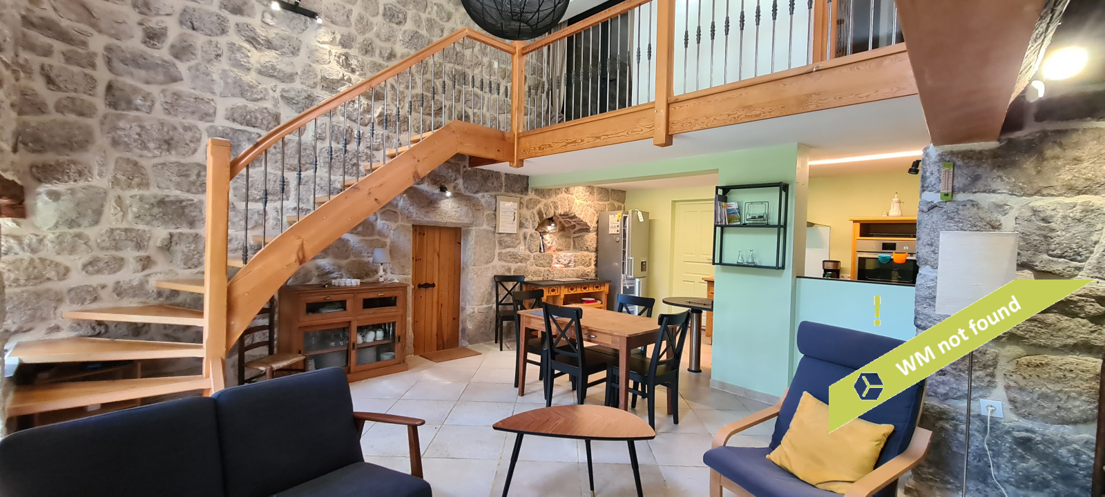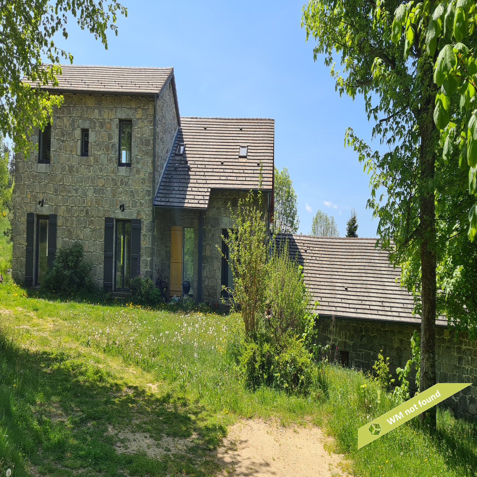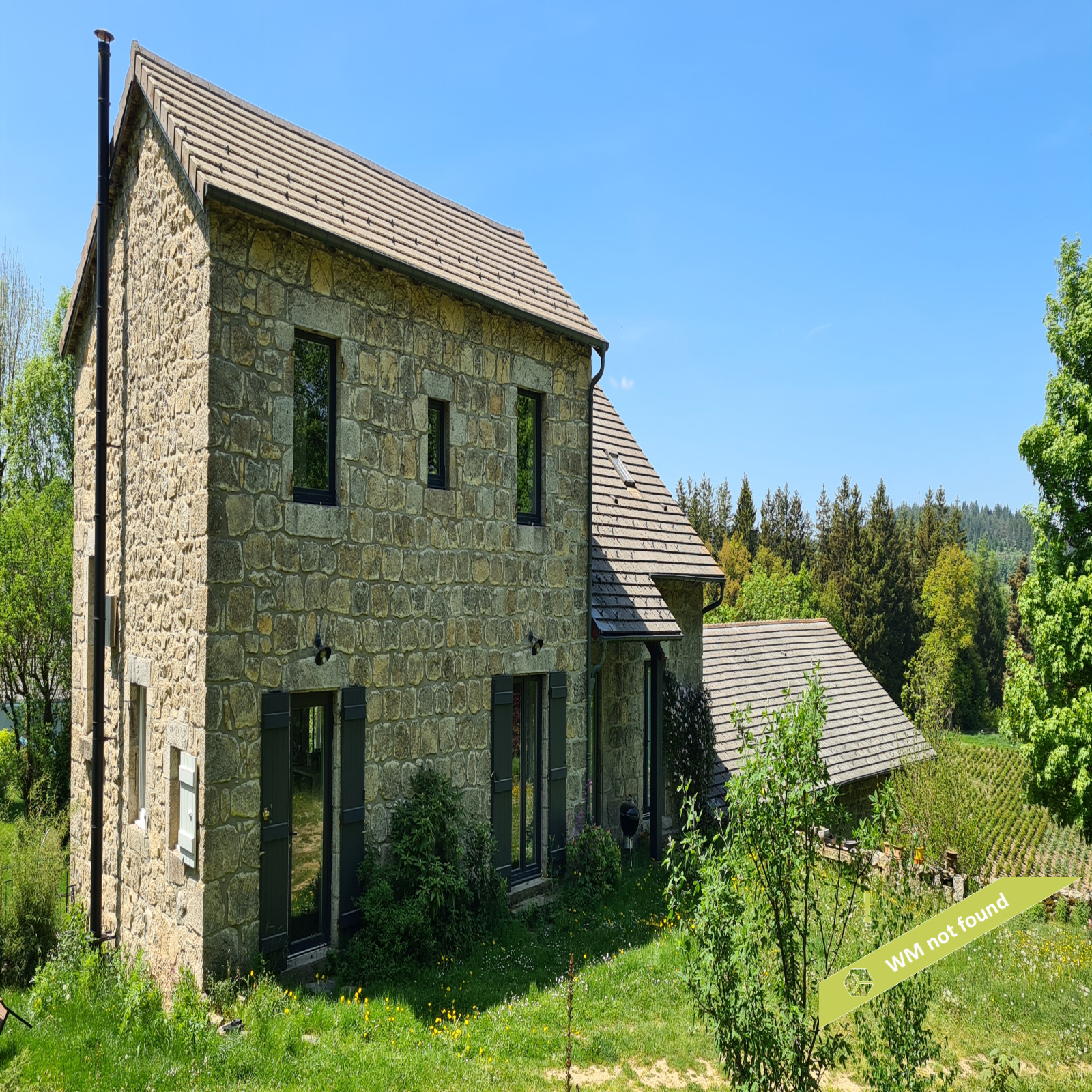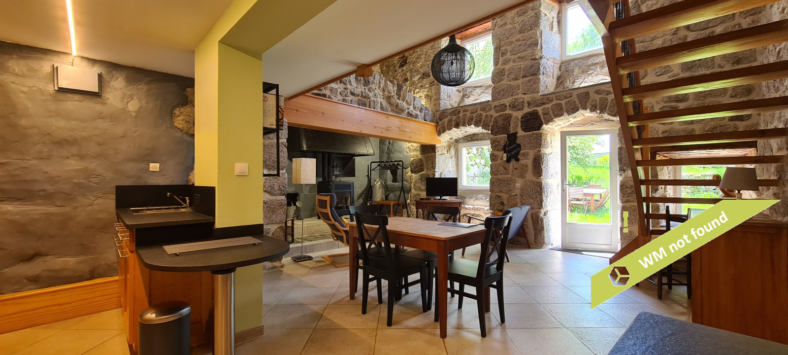 - La 2ème partie est accessible également depuis la salle-à-manger de la 1ère partie. On y trouve un vaste hall avec placards en bois massif (10,70 m²), un salon (38,47 m²), un petit bureau avec placards (3,37 m²). L'étage compte 2 chambres mansardées (11,13 m² et 12,20 m²), une salle de bains avec douche et baignoire et un wc. Quelques escaliers plus bas, on arrive sur une coursive (7,01 m²) permettant d'accéder à une chambre avec salle d'eau et wc (17,81 m²) et à une terrasse. Le rez-de-chaussée enfin accueille une cuisine ouverte sur la salle-à-manger (43,13 m²) avec son magnifique cantou, un cellier et un wc.