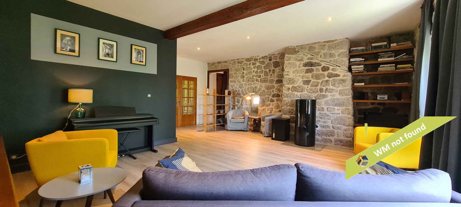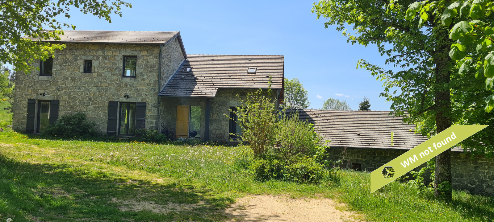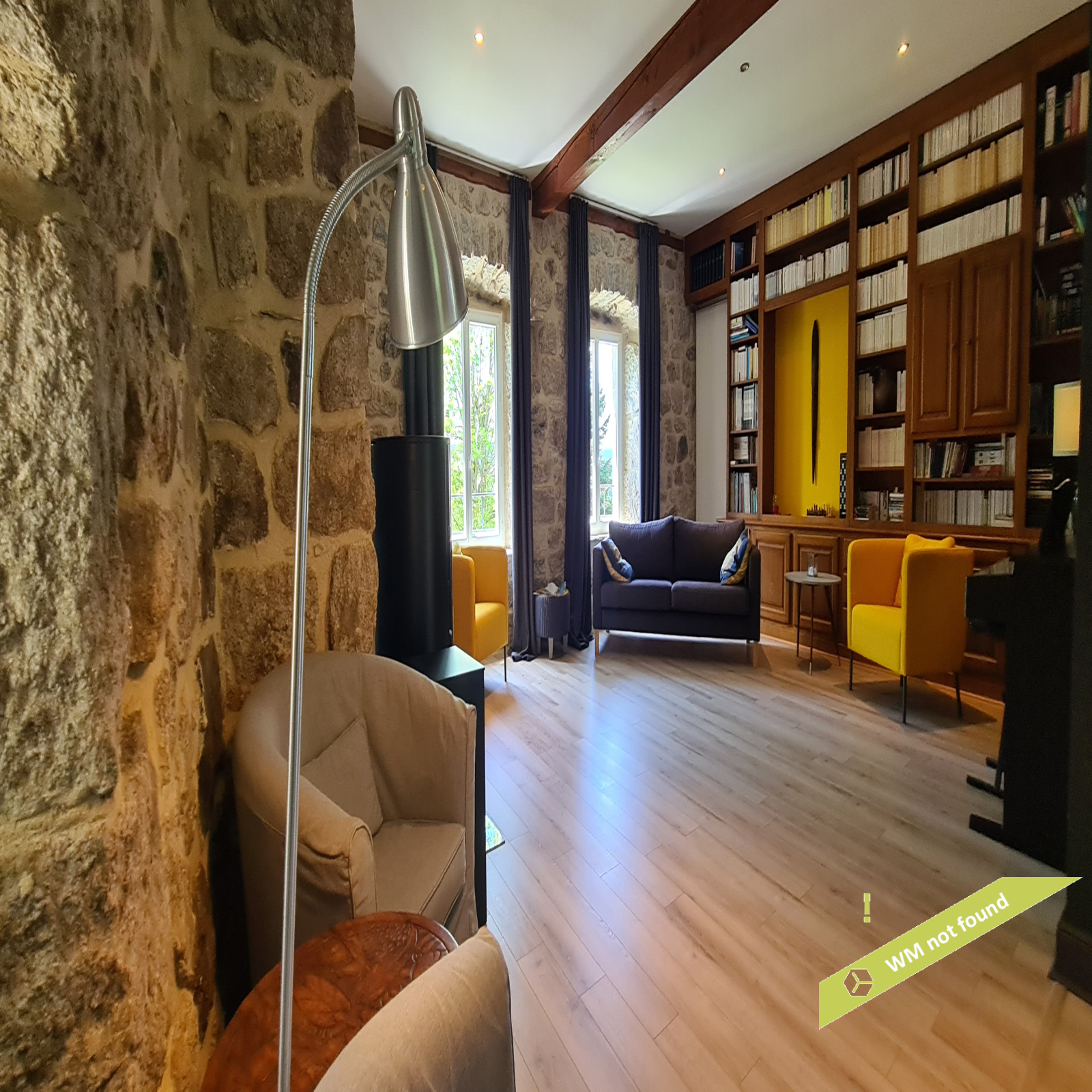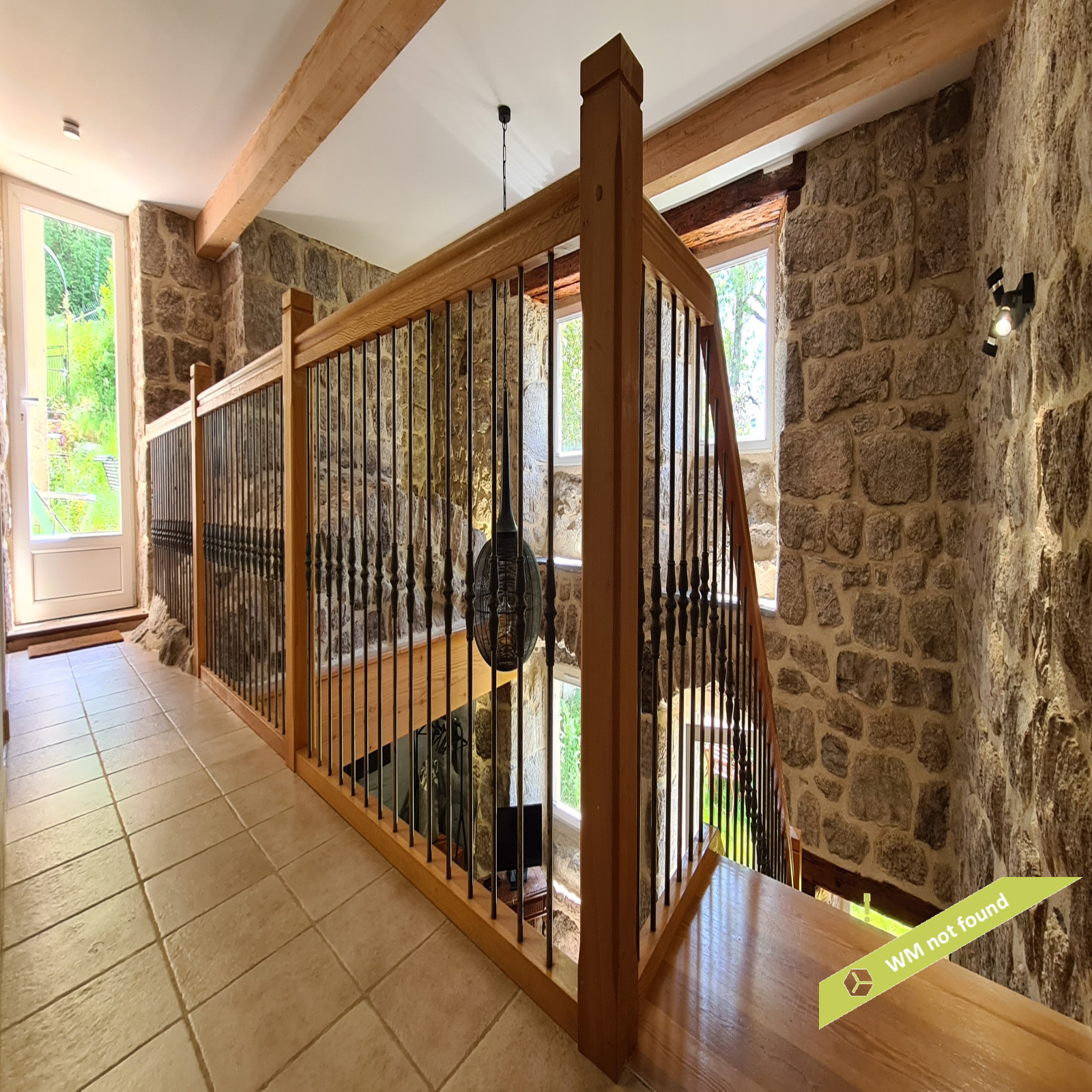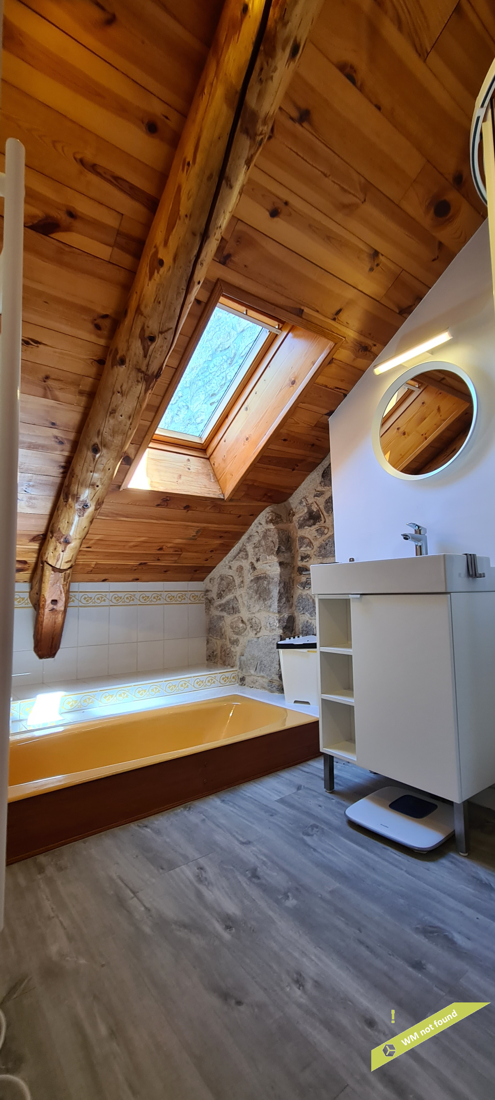 - La 2ème partie est accessible également depuis la salle-à-manger de la 1ère partie. On y trouve un vaste hall avec placards en bois massif (10,70 m²), un salon (38,47 m²), un petit bureau avec placards (3,37 m²). L'étage compte 2 chambres mansardées (11,13 m² et 12,20 m²), une salle de bains avec douche et baignoire et un wc. Quelques escaliers plus bas, on arrive sur une coursive (7,01 m²) permettant d'accéder à une chambre avec salle d'eau et wc (17,81 m²) et à une terrasse. Le rez-de-chaussée enfin accueille une cuisine ouverte sur la salle-à-manger (43,13 m²) avec son magnifique cantou, un cellier et un wc.