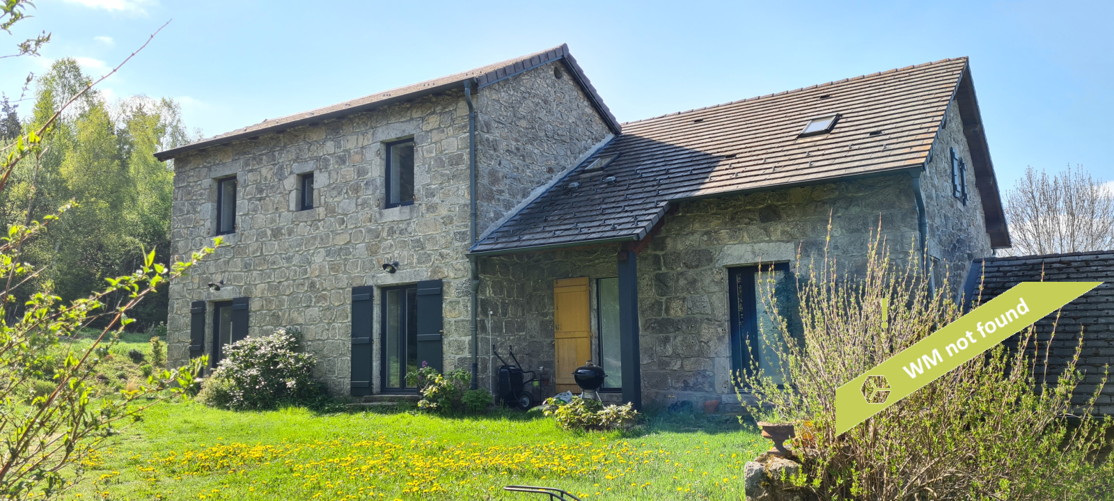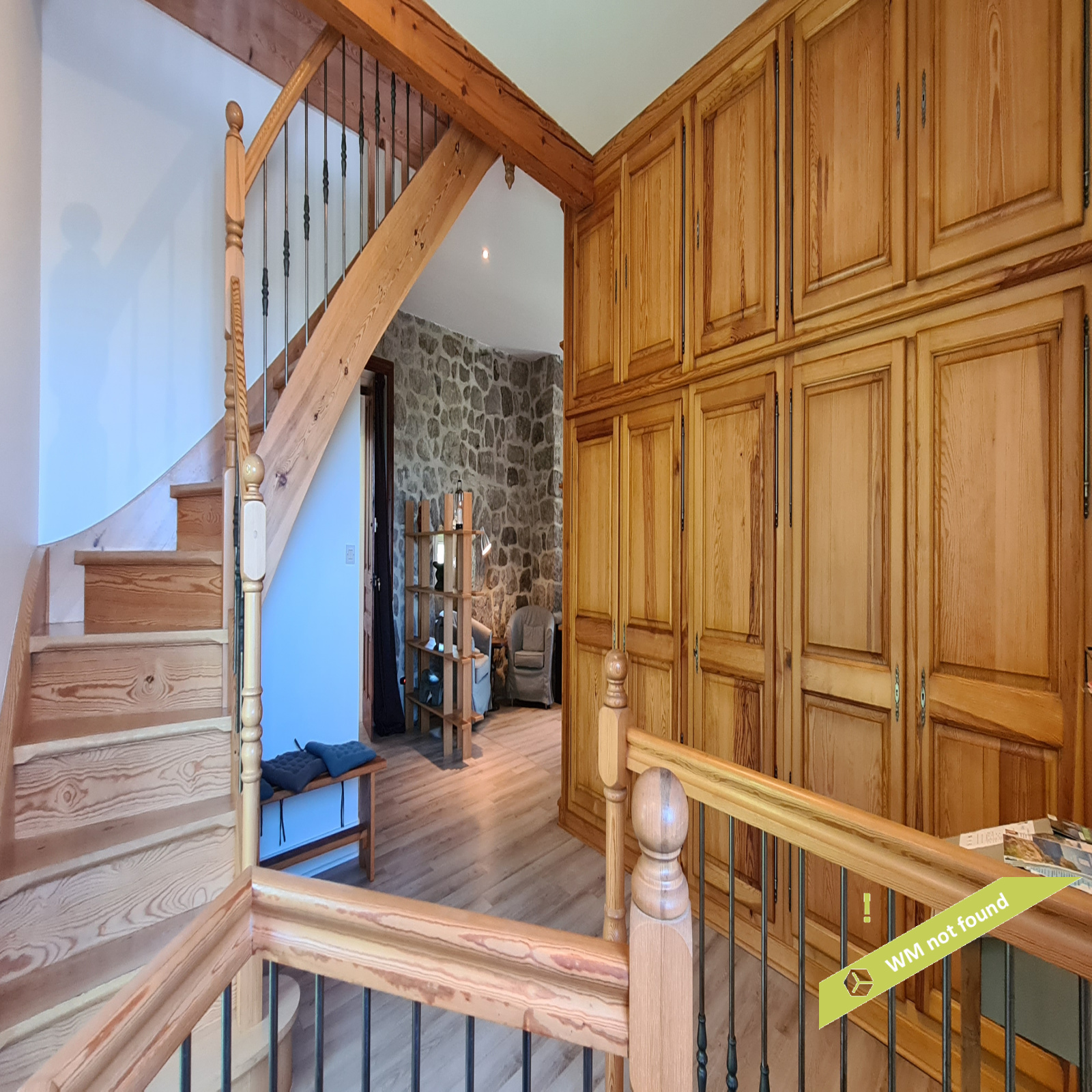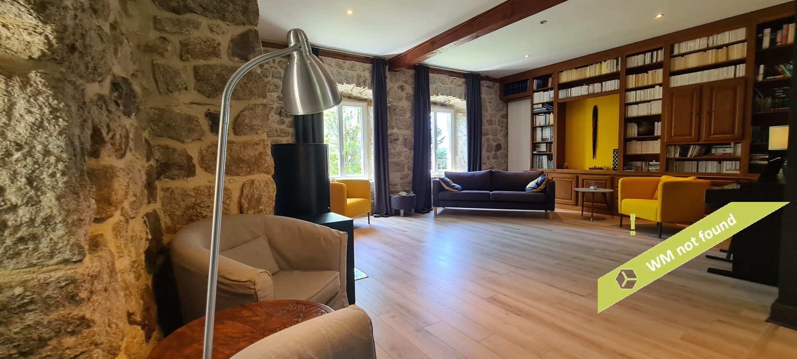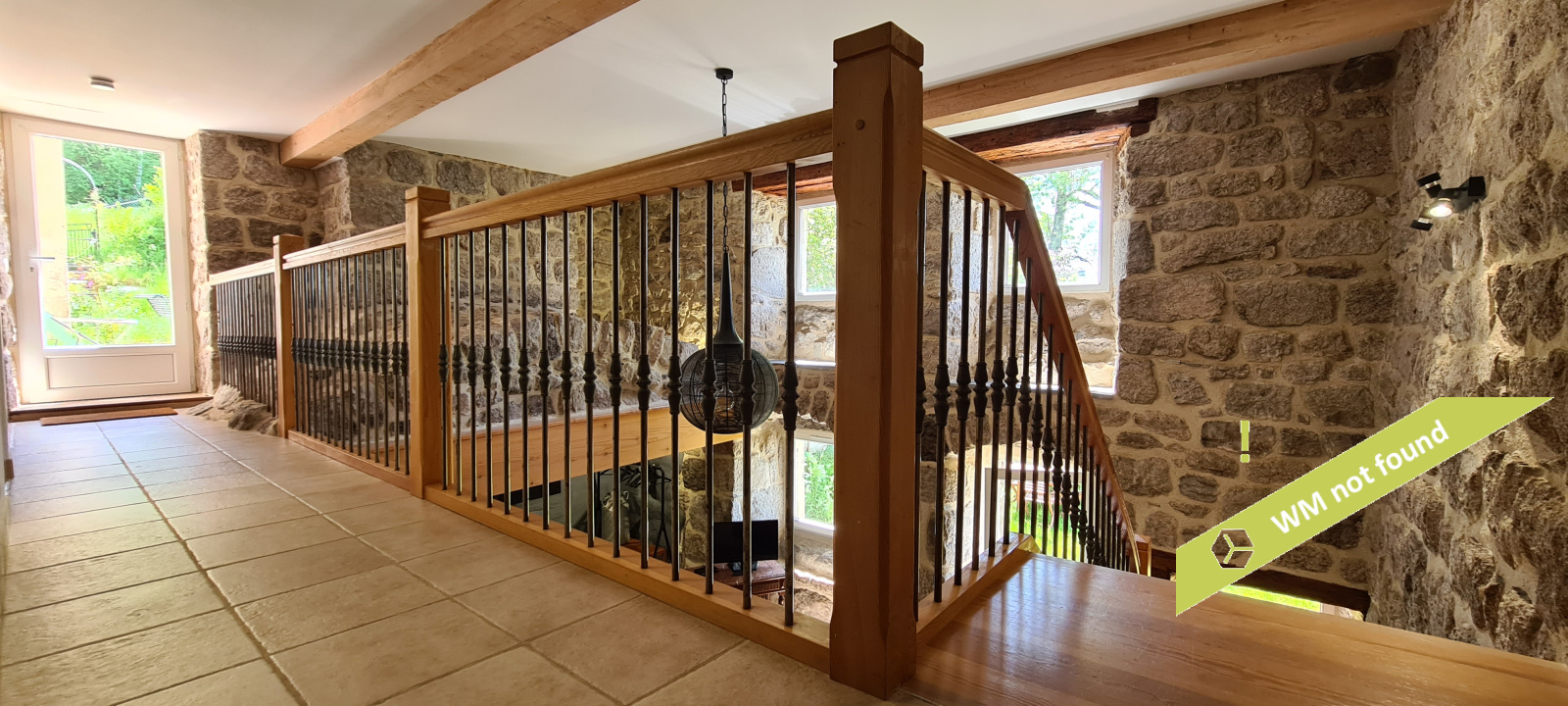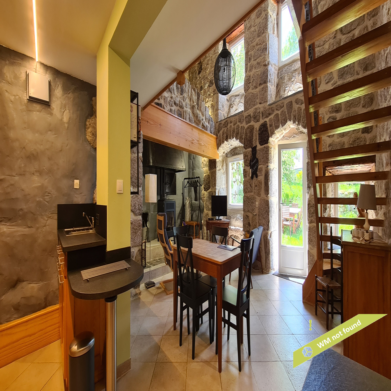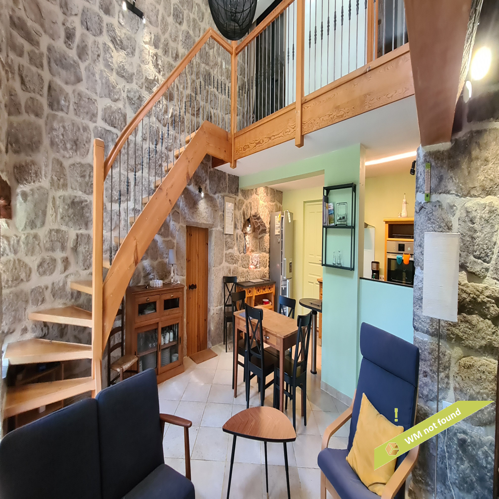 - La 2ème partie est accessible également depuis la salle-à-manger de la 1ère partie. On y trouve un vaste hall avec placards en bois massif (10,70 m²), un salon (38,47 m²), un petit bureau avec placards (3,37 m²). L'étage compte 2 chambres mansardées (11,13 m² et 12,20 m²), une salle de bains avec douche et baignoire et un wc. Quelques escaliers plus bas, on arrive sur une coursive (7,01 m²) permettant d'accéder à une chambre avec salle d'eau et wc (17,81 m²) et à une terrasse. Le rez-de-chaussée enfin accueille une cuisine ouverte sur la salle-à-manger (43,13 m²) avec son magnifique cantou, un cellier et un wc.