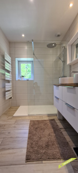 - La 1ère partie est constituée d'une cuisine (10,68 m²) et d'une salle-à-manger (26,49 m²), largement ouvertes sur le jardin et la campagne environnante grâce notamment à des portes vitrées. A l'étage, on trouve 2 chambres (9,66 m² et 17,34 m²), une salle d'eau, un wc et un dégagement avec placards. Au sous-sol, avec accès direct dans le jardin : 2 espaces (14,02 m² et 29,22 m²), dont la chaufferie.