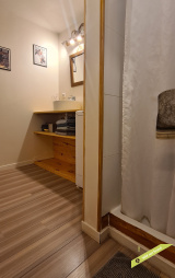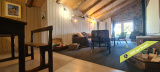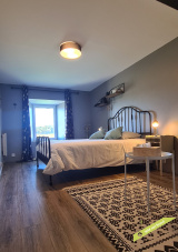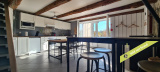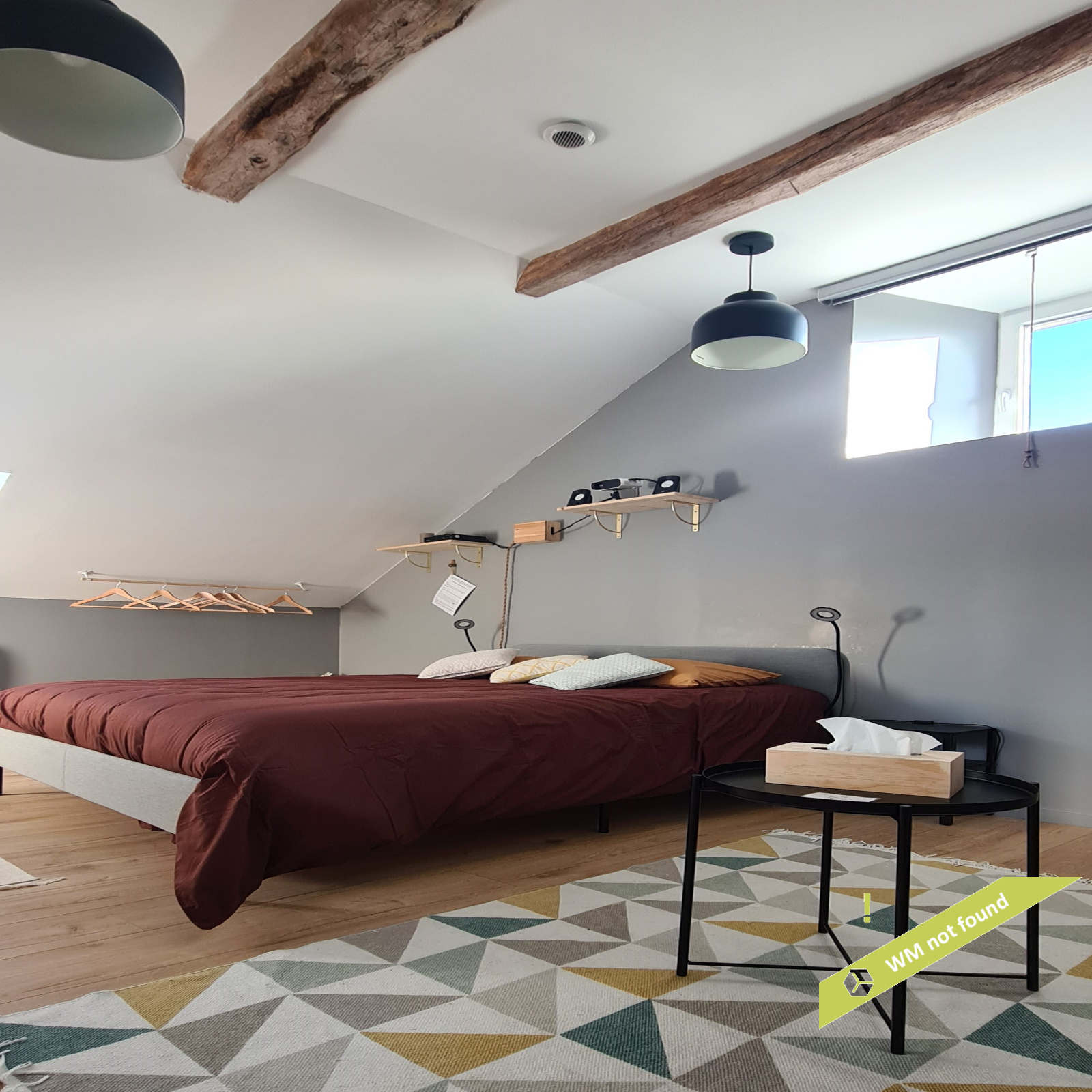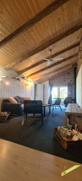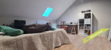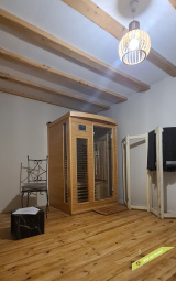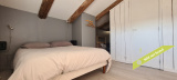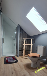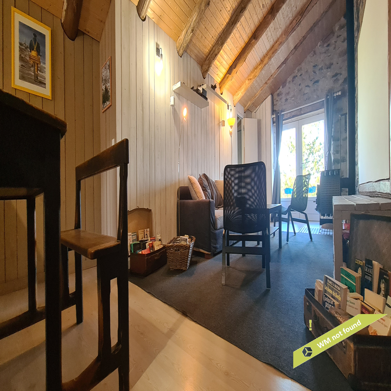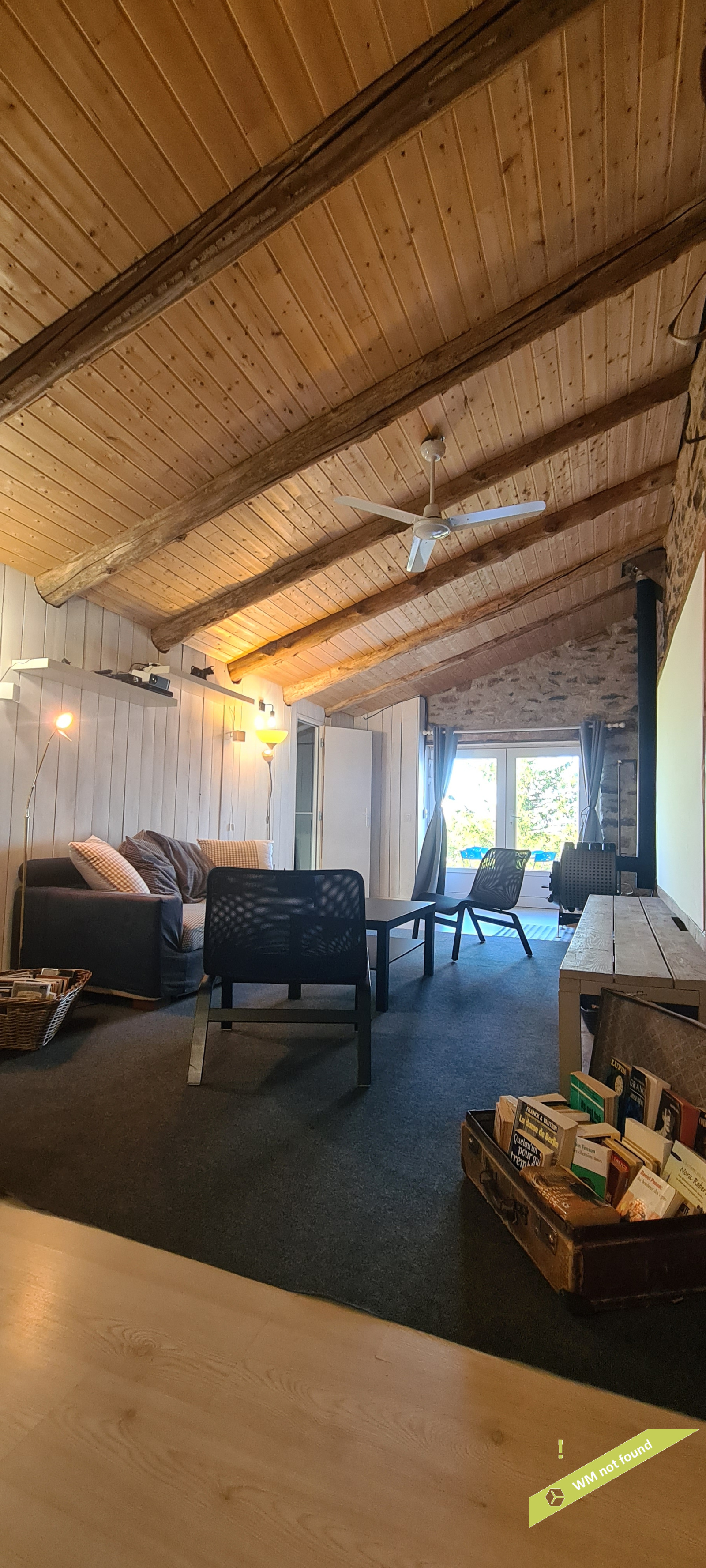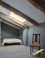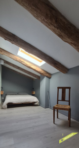 La partie gîte est composée d'une pièce principale de 23,98 m², à usage de cuisine/salle-à-manger. On y accède notamment depuis une terrasse, côté sud. A l'étage, on trouve un séjour de 37,38 m², ouvrant sur une terrasse, deux chambres mansardées (14,38 m² au sol pour 9,22 m² habitables et 13,19 m² au sol pour 7,98 m² habitables), un wc et une salle d'eau (6,14 m²).