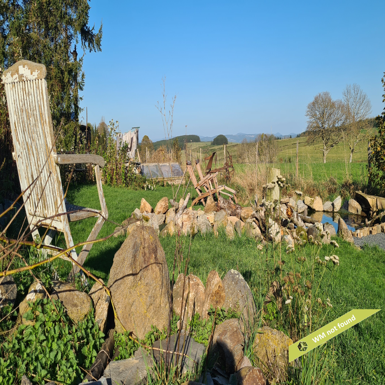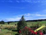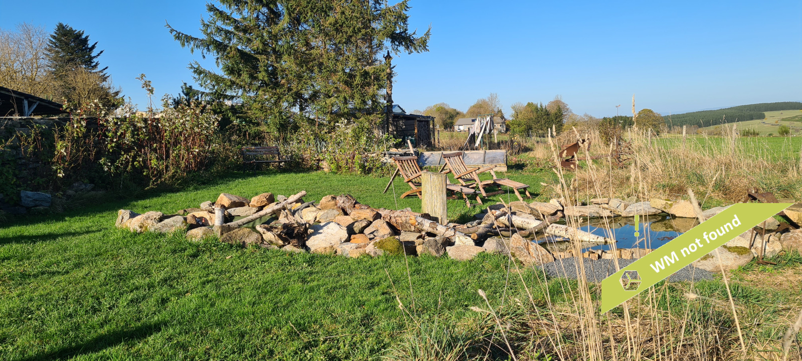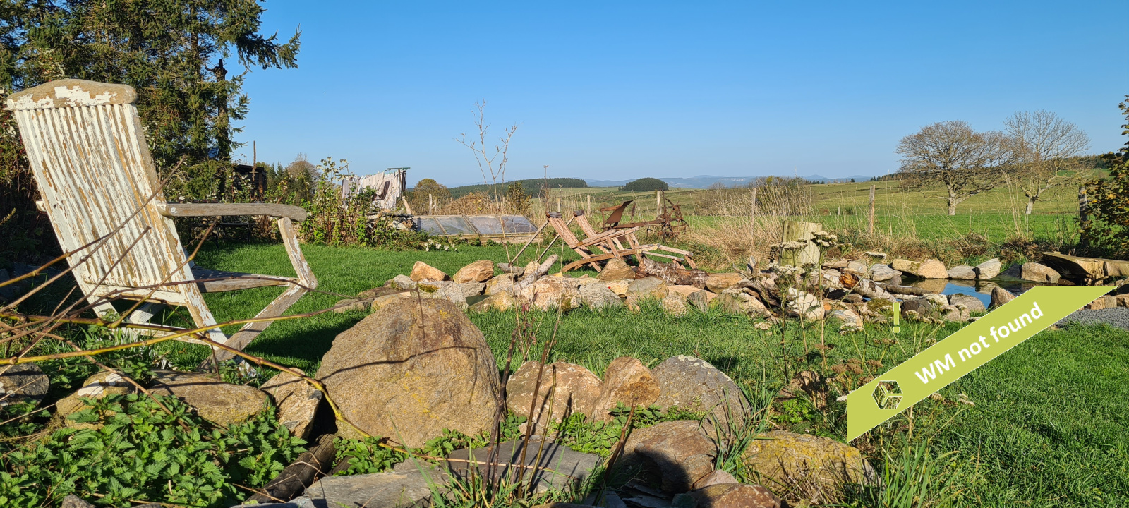 Le terrain est essentiellement situé devant la maison, il est plat et garni de quelques arbustes, d'une source, alimentant deux mares et d'une réserve d'eau (30000 litres).