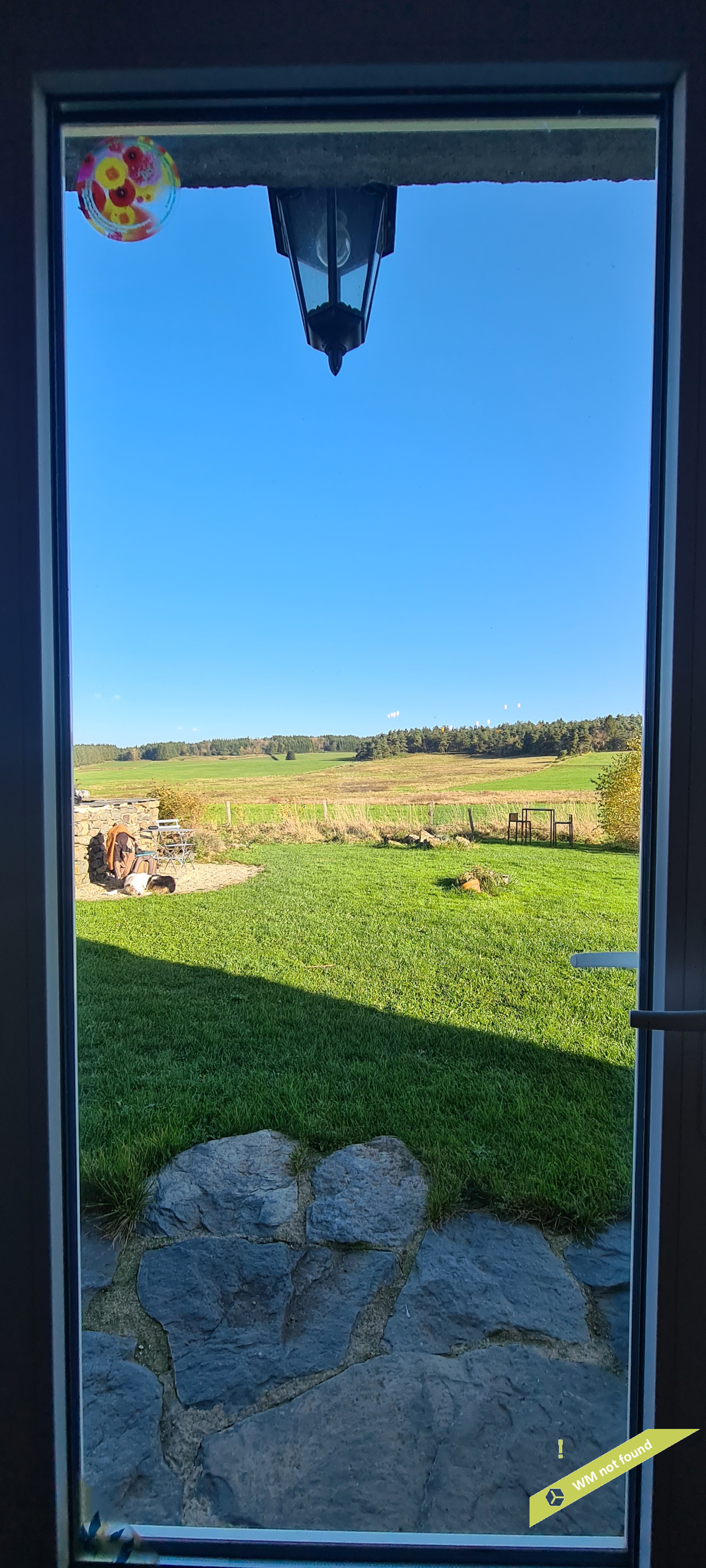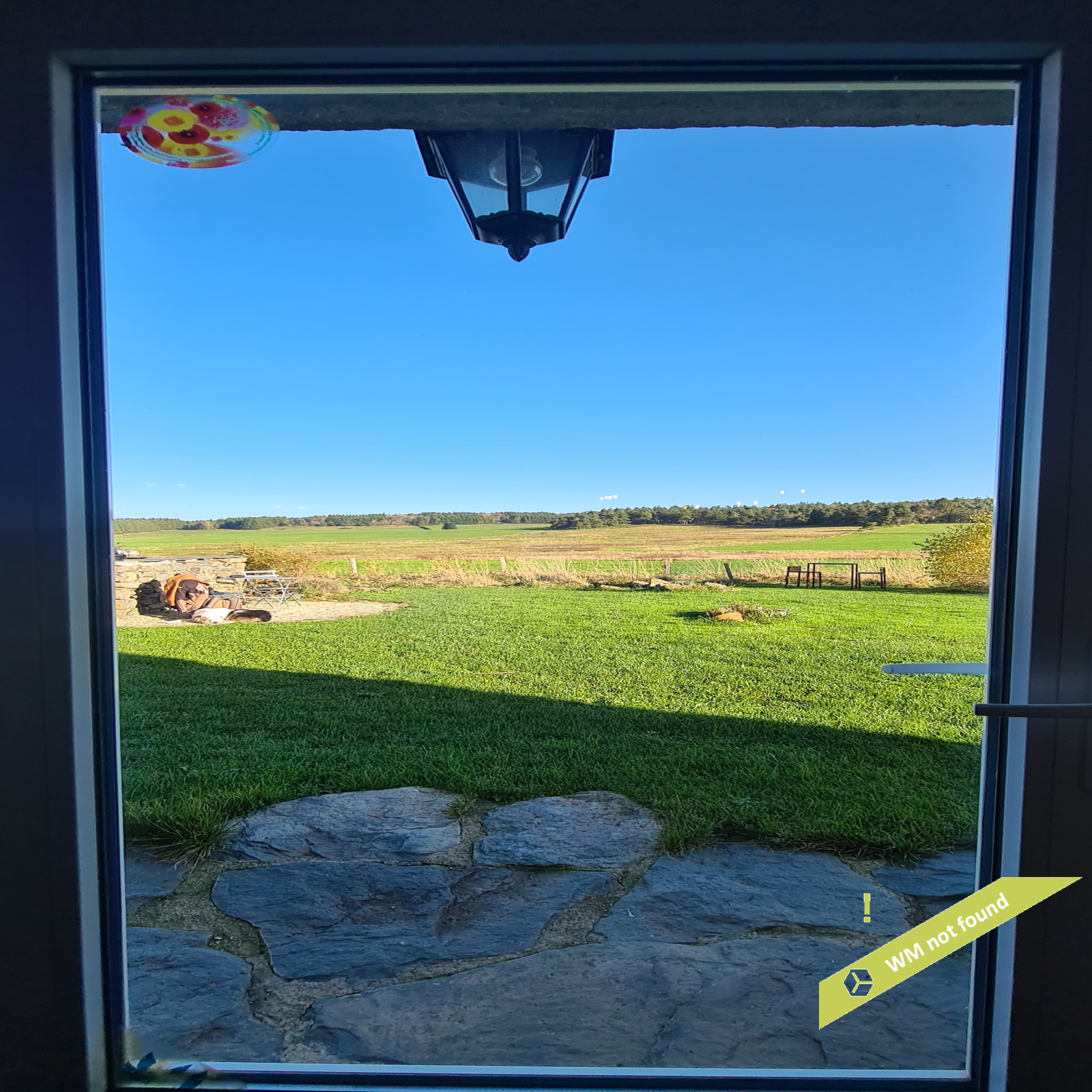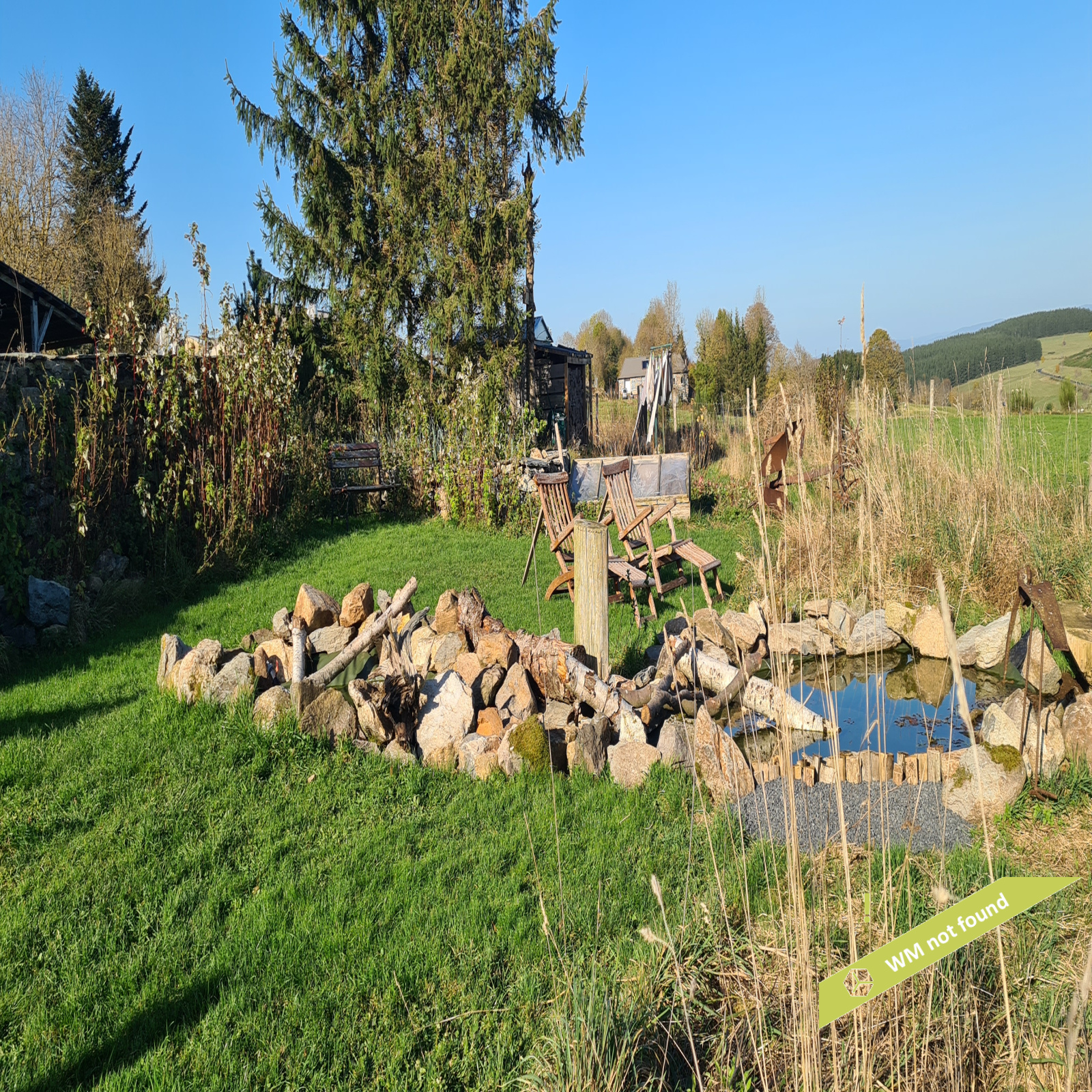 Le terrain est essentiellement situé devant la maison, il est plat et garni de quelques arbustes, d'une source, alimentant deux mares et d'une réserve d'eau (30000 litres).