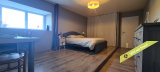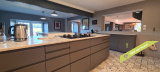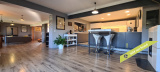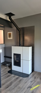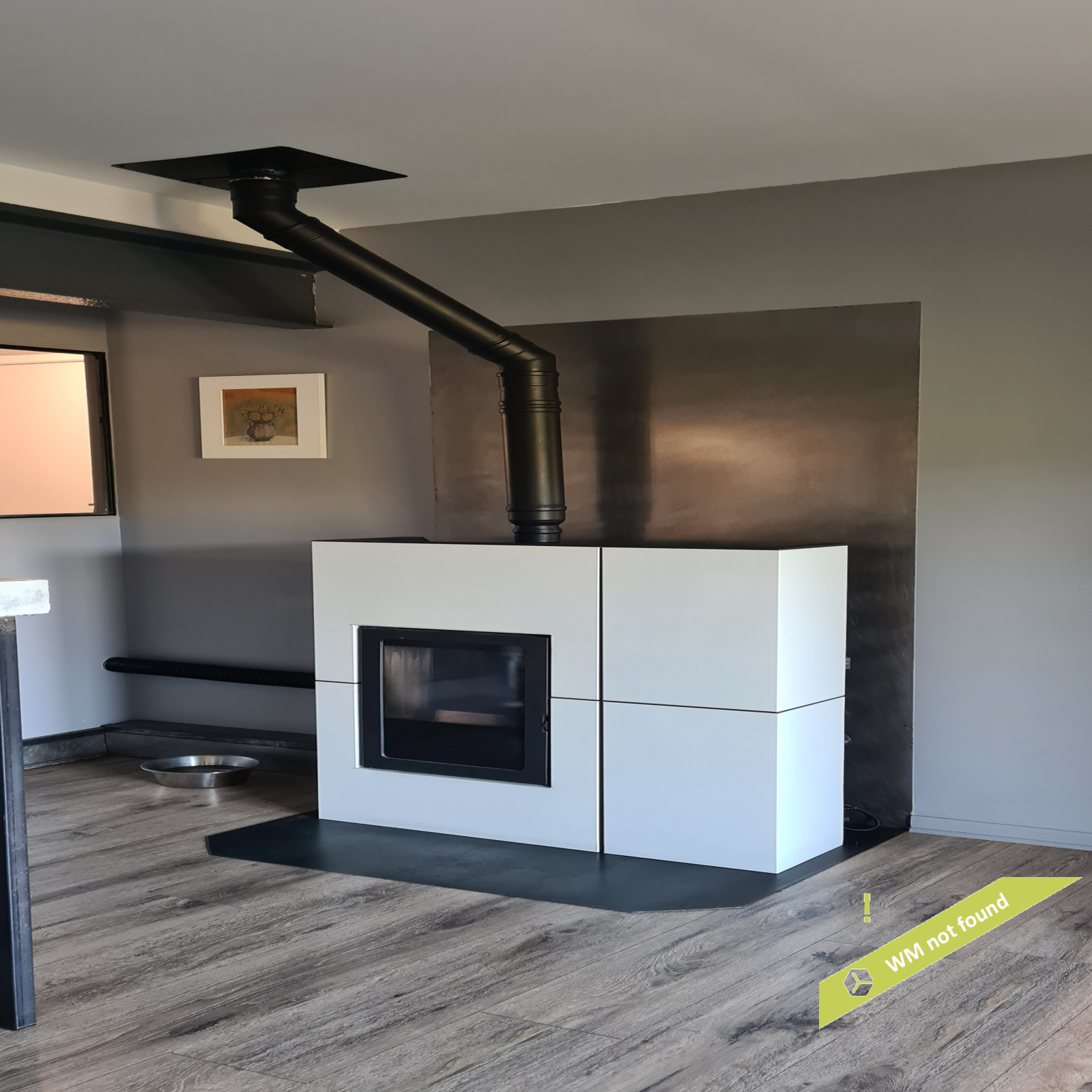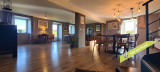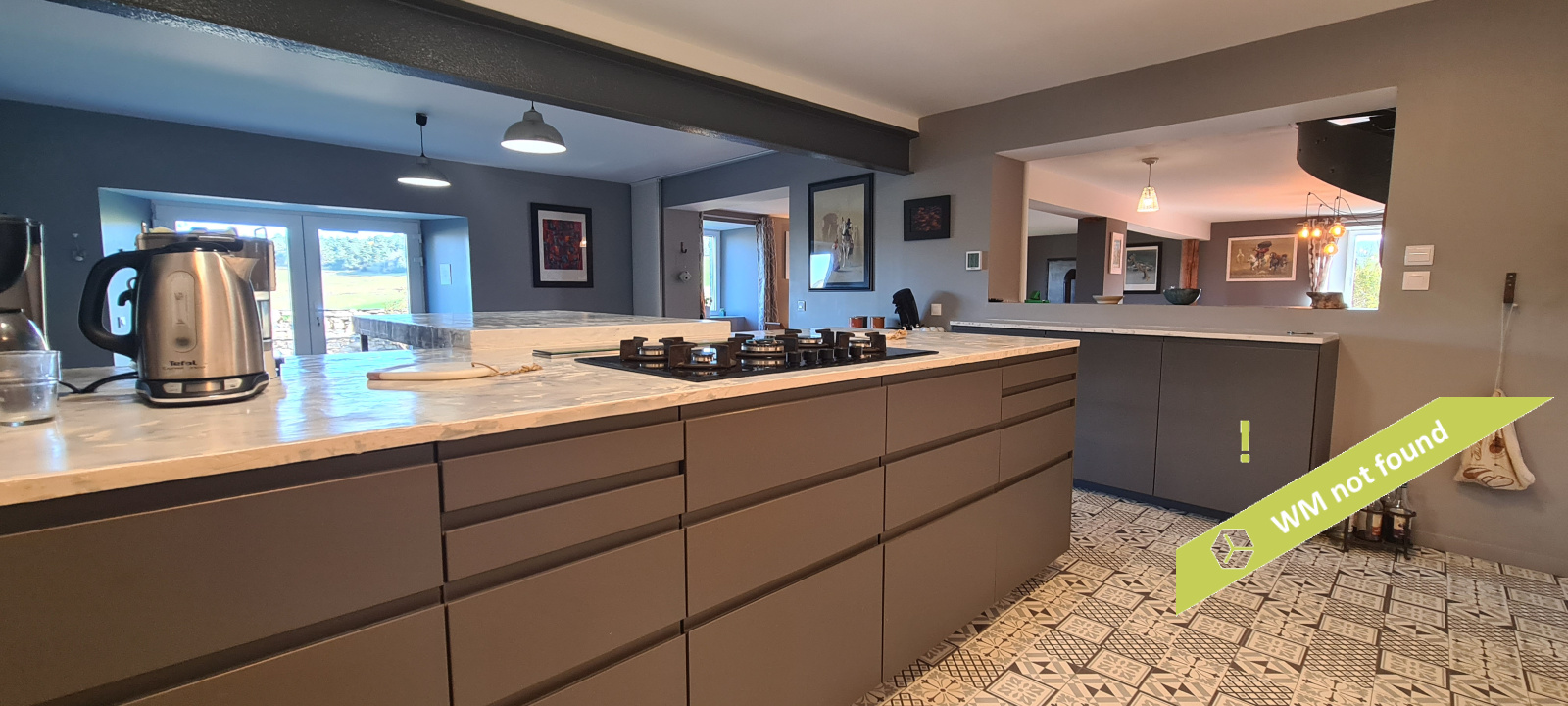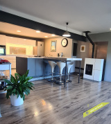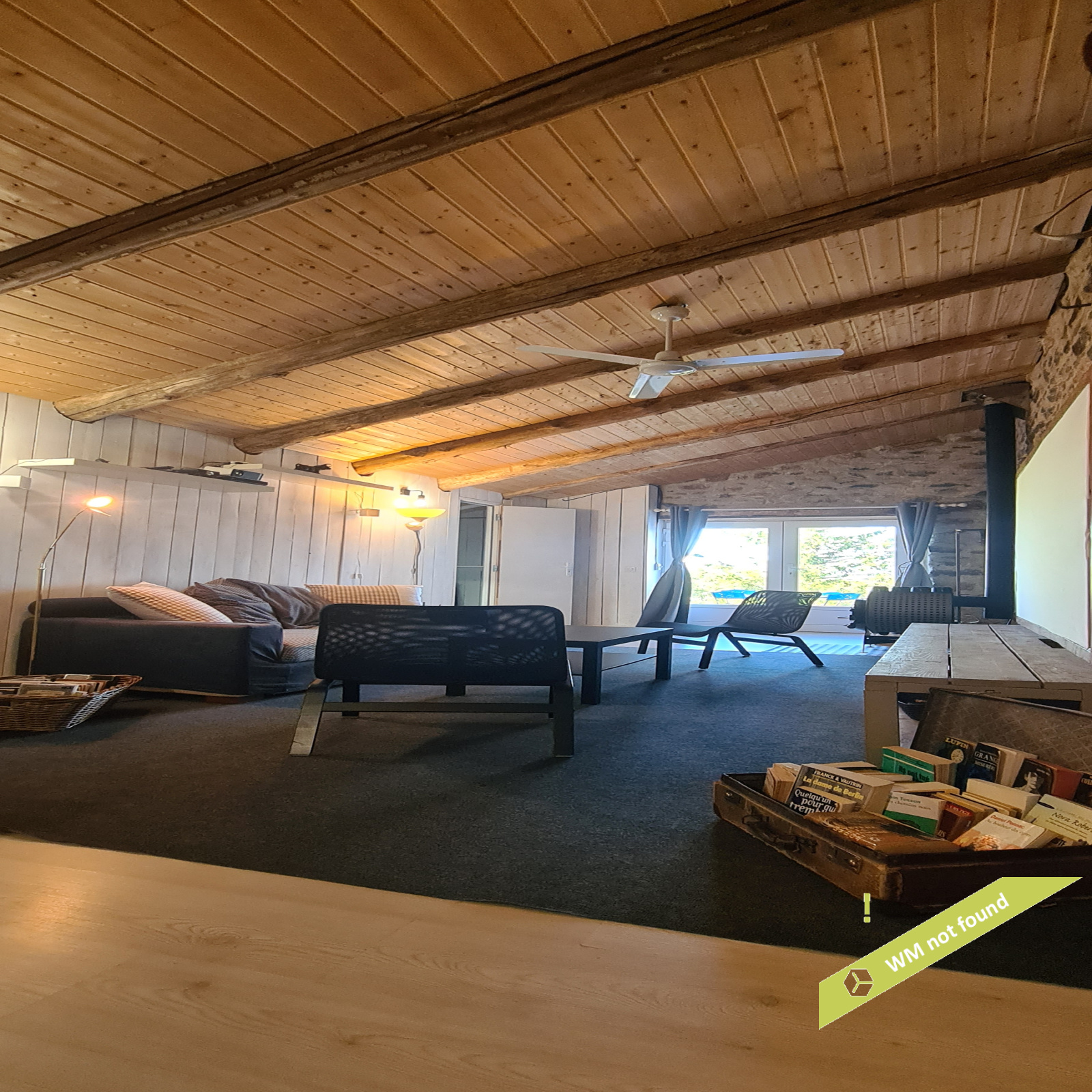 La partie habitation principale est composée au rez-de-chaussée d'une cuisine ouverte (38,37 m²), d'un séjour (59,11 m²), d'un vaste dégagement (17,29 m²) permettant d'accéder à une chambre (23,93 m²), une salle de bains avec douche et baignoire (10,77 m²), un cellier (7,96 m²), une buanderie (9,34 m²), et à 2 wc avec coin lavabo. Un poêle à bois est installé dans le salon, renforçant l'ambiance confortable de la pièce, propice au repos.