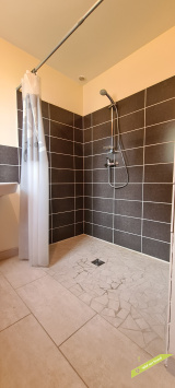 Il comprend une partie habitation de 133,49 m², entièrement rénovée en 2011 : un hall d'entrée équipé d'un grand placard (11,34 m²) dessert une pièce à usage de cuisine/salon/salle-à-manger (48,78 m²), une chambre (13,29 m²), un wc, une salle d'eau et un cellier. L'étage comprend deux chambres (13,38 m² et 10,37 m²), une pièce (7,90 m²), une salle de bains avec baignoire et douche, un wc. La pièce principale est très lumineuse et traversante : une large baie vitrée ouvre sur une terrasse et sa vue dégagée à l'ouest. Une porte vitrée permet d'accéder au jardin côté est : la forme en L de la propriété confère à cette partie une ambiance intimiste.