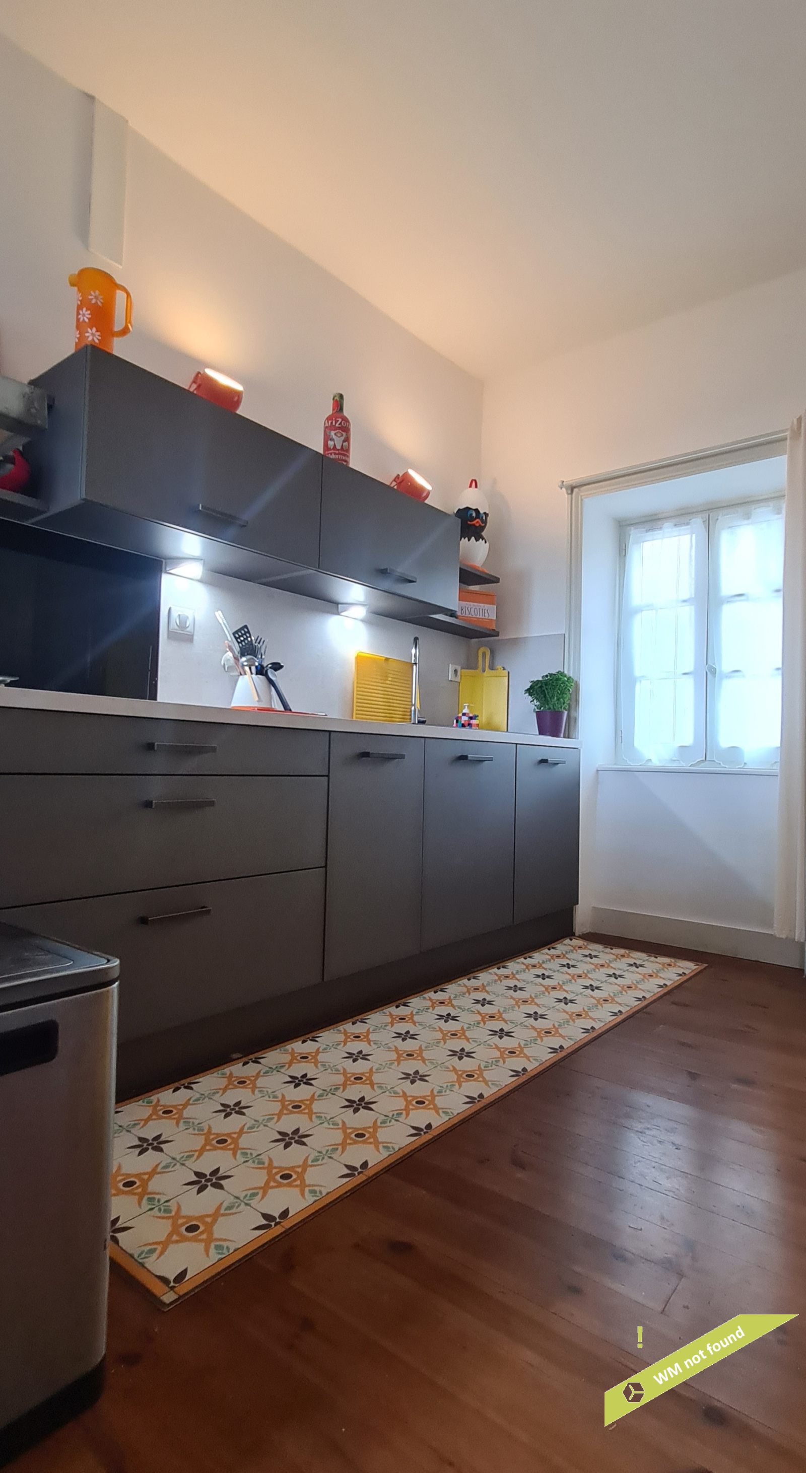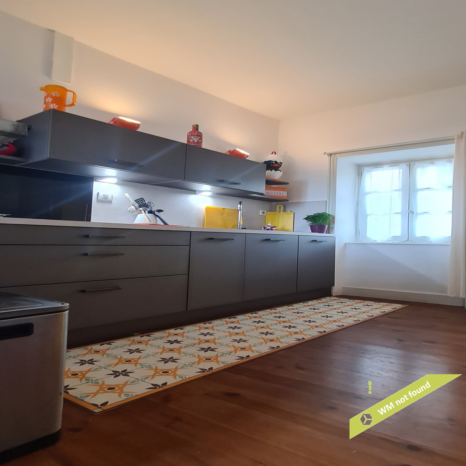 Rez-de-chaussée : hall d’entrée de 6,76 m², salon lumineux de 21,15 m² avec trois fenêtres et poêle à bois, cuisine de 19,26 m²
