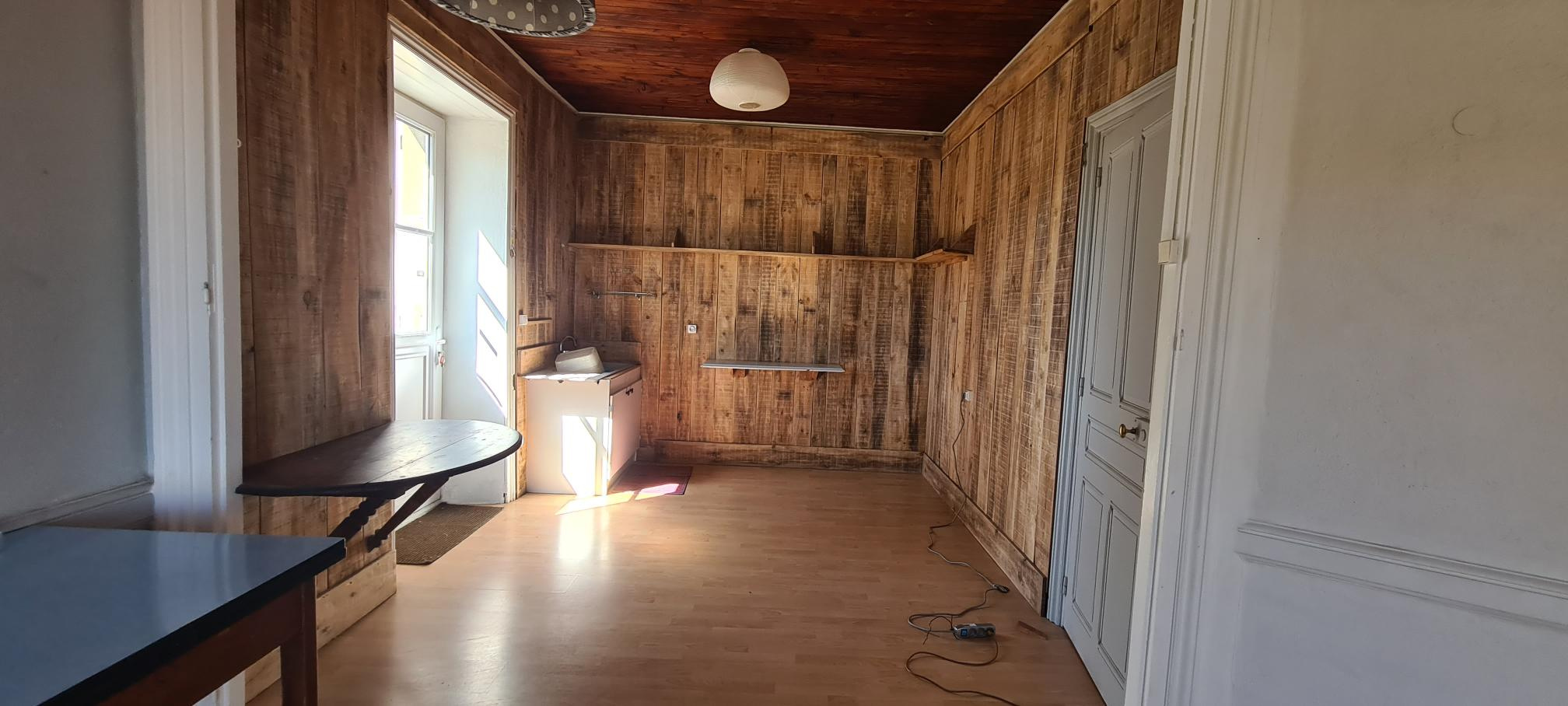 Au rez-de-chaussée, une agréable pièce de vie de 26,73 m² à usage de cuisine et salle à manger, équipée d’un poêle, avec accès direct à une petite terrasse intimiste.